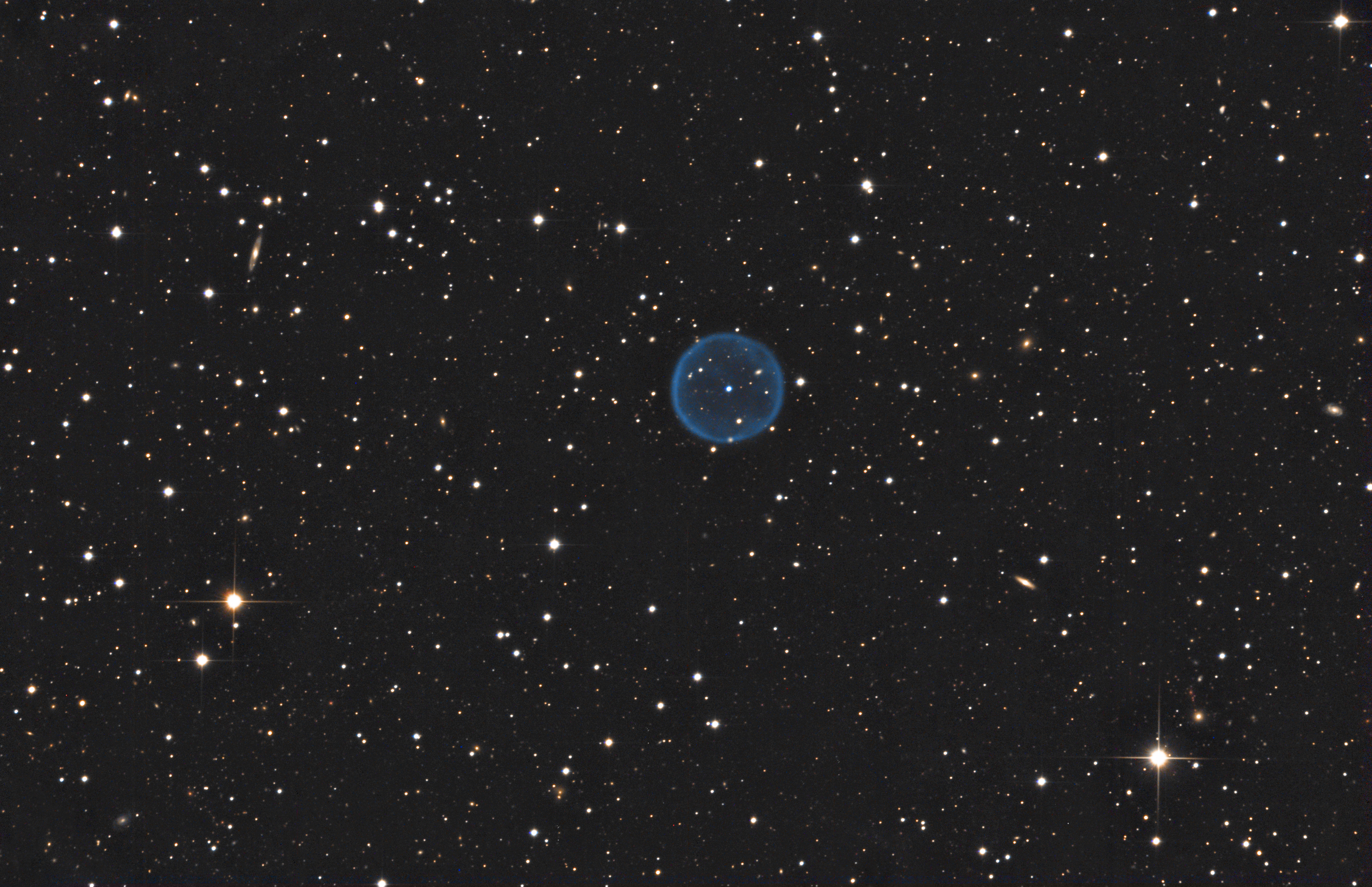 Abell 39 shows an almost perfect spherical bubble like a picture book for a planetary nebula. The western edge is about 50% brighter than the eastern. The central star is also not exactly in the centre, but offset by about 2". It seems that this is due to a slightly asymmetrical ejection of matter and not an interaction with interstellar matter. It is estimated that the central star and the ejected material each have 0.6 solar masses. [333]