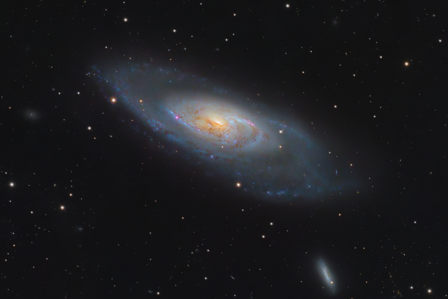 The image shown in Fig. 5 is a combination of images taken with the Hubble Space Telescope (central region) and earth-based 12.5 and 20 inch telescopes from Robert Gendler in New Mexico. It shows one of the most striking features of the M 106: an additional pair of arms. Most spiral galaxies only have one pair of arms, but M 106 has an additional set that can be seen here as scraps of red gas. In contrast to the other arms, these two additional arms are made out of hot gas rather than stars. Astronomers attribute these ghostly arms to the supermassive black hole at the centre of the galaxy. The extra arms appear to be an indirect result of the violent swirling of matter around the black hole. Heliocentric velocities measured in the last 20 years range from 416 km/s to 456 km/s and distances from 6.6 Mpc to 7.6 Mpc (21 to 24 million light years) [145, 215]