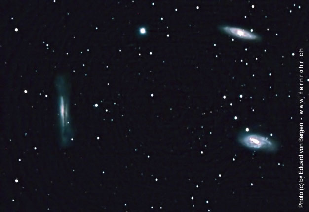 The three galaxies M 65, M 66 and NGC 3628 show gravitational interactions with one another, which mainly influenced the appearance of M 66. The dusty spiral arms are slightly asymmetrical and contain many clusters of bright stars. A weak spiral arm on the north side seems to have already detached itself, which can be seen particularly well in the illustration of the «Sloan Digitized Sky Survey» in Fig. 2. At NGC 3628 we are looking exactly on the edge at a dense band of dust. [196]