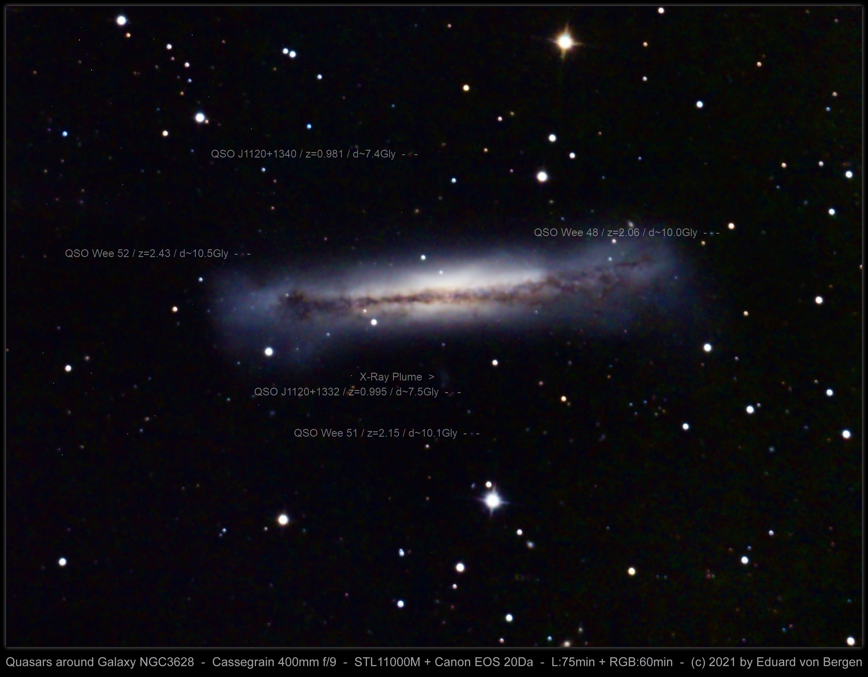 Scientific work on the galaxy NGC 3628 and the gas surrounding it brought some quasars to light. A closer look at the image of the galaxy NGC 3628 in the constellation of Leo reveals not only the X-ray flag but also very distant quasars. Five quasars with a light transit time of approx. 7.4 to 10.5 GLy with a corresponding redshift can be made out around the galaxy NGC 3628. The record in the picture is held by Quasar Wee 52 with a z of 2.43 or a large redshift. [395]
