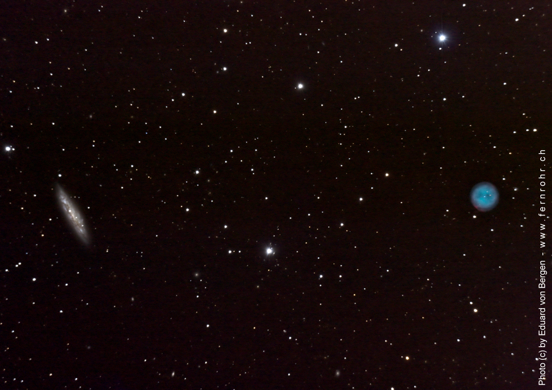 M 97 + M 108: Owl Nebula M 97 and Galaxy M 108 Ursa Major; 10" Meade Schmidt-Newton; Canon EOS 20Da; 75 min, ISO 1600; Oberes Schlierental, Glaubenbergpass; © 2007 Eduard von Bergen [30]