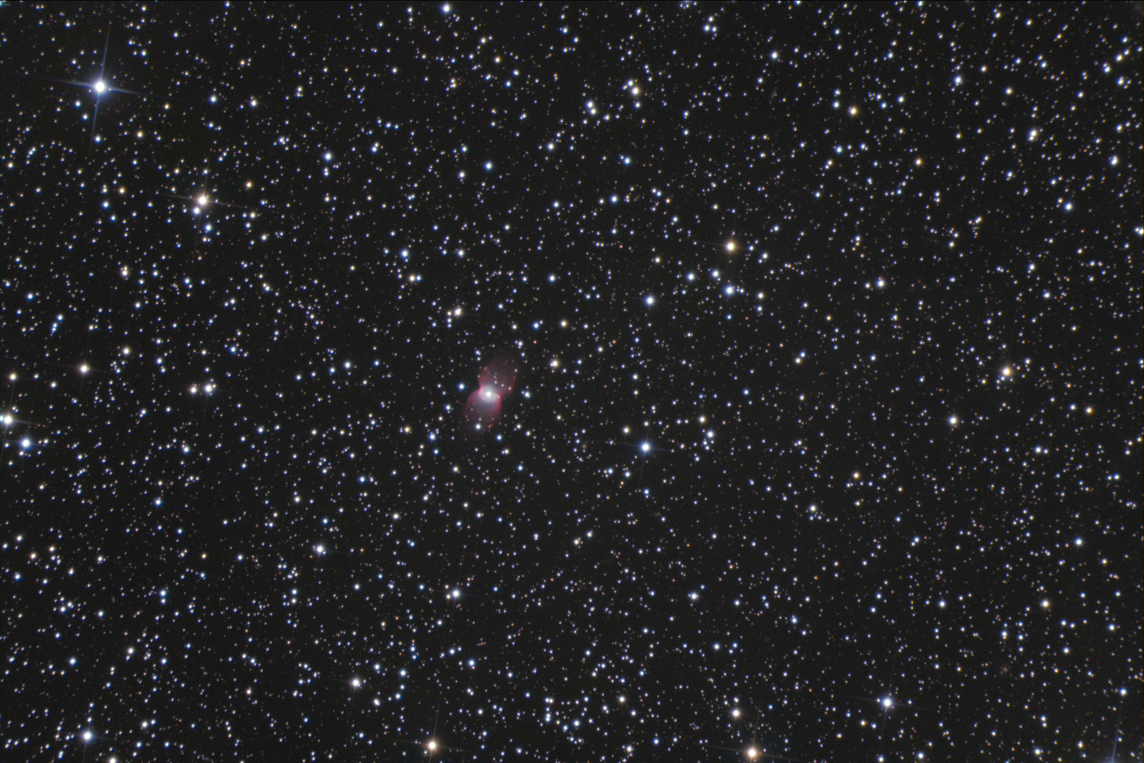 The Butterfly Nebula lies between the bright stars Sirius (α Canis Majoris) and Procyon (α Canis Minoris) near the 4.2 mag star δ Monocerotis. The PN is found just 40 arc minutes west-south-west of δ Monocerotis. It can already be seen in a 15cm telescope as a faint, rectangular nebula.