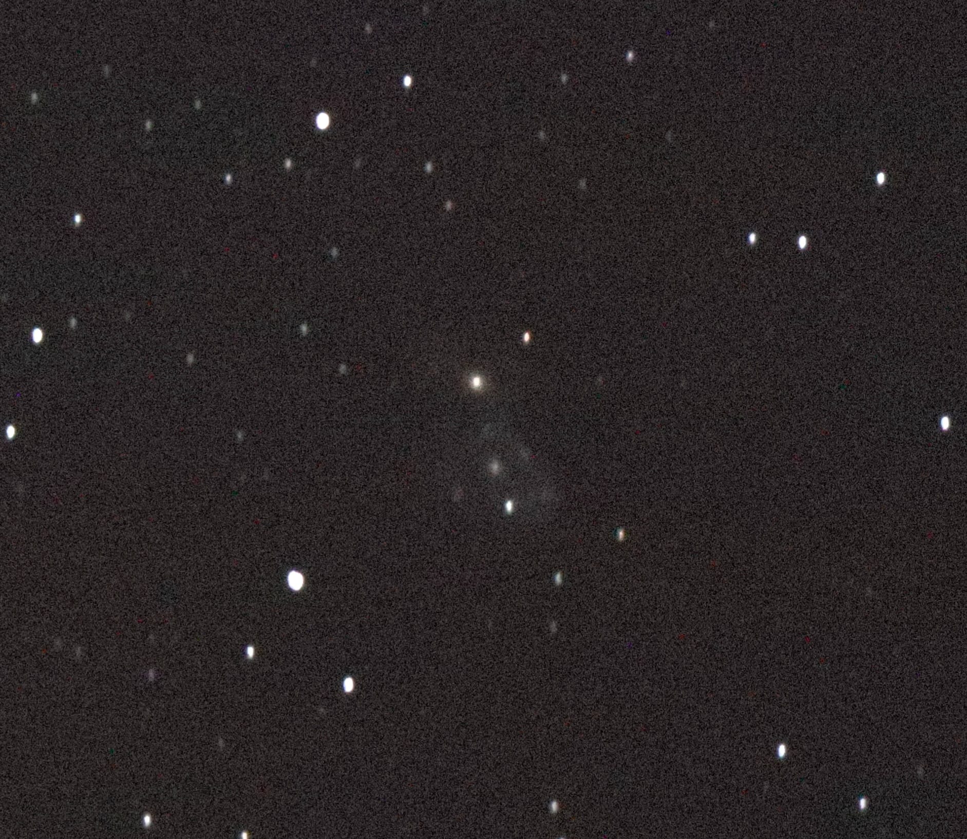 762 mm Aperture: The irregular galaxy pair NGC 2444 and NGC 2445 shows a fine halo around two bright, star-shaped cores. In the EAA image, the halo around the yellowish galaxy nucleus can only just be guessed. — 30" SlipStream-Dobson f/3.3, EAA-Photo, Canon EOS R, 10s bei ISO 40'000, Hasliberg, SQM 21.3, 3. 2. 2024, Eduard von Bergen