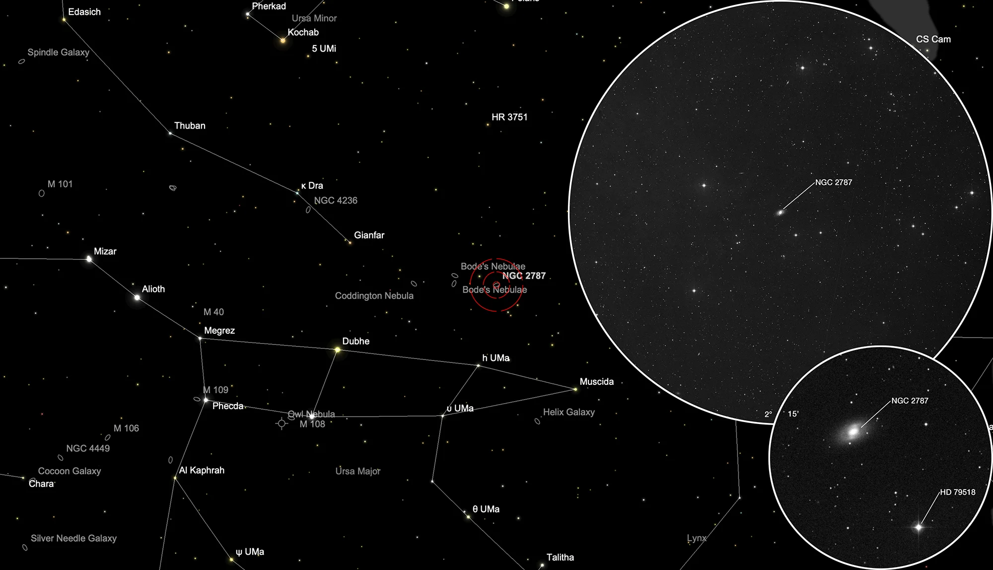 Die Galaxie NGC 2787 befindet sich im Sternbild Ursa Maior. Am 7. Februar steht sie in Opposition zur Sonne und ist daher um Mitternacht Ortszeit am höchsten am Himmel.