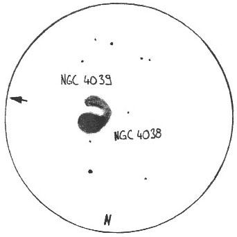 350 mm Öffnung: Im 14-Zöller erscheinen beide Kerne sehr ausgeprägt. Die nördliche Galaxie NGC 4038 gibt sich heller und grösser. Südlich und fast nahtlos schliesst der etwas schwächere Galaxienkern von NGC 4039 an. Auf Fotos und mit Fantasie auf der Skizze erinnern die beiden Galaxien an einen Fötus. Die Antennen bei beiden Galaxien sind visuell mit den Amateurteleskopen nicht zugänglich. — 14" PWO-Dobson, F:4.6 / TV-Radian 8mm, 200x, 0.3°, Eduard von Bergen[192]