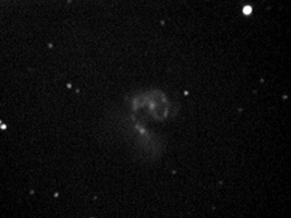 400 mm Öffnung: Im 21 mm Ethos Okular fallen einem als erstes zwei miteinander verbundene, nebelhafte Ovale auf, welche an ein Prussiens-Gebäck erinnern. Selbst bei höherer Vergrößerung zeigten sich nicht mehr Details, geschweige denn die Antennen. Die Horizontnähe und der bevorstehende Mondaufgang waren hier nicht sehr hilfreich. — 400 mm f/4.5 Taurus Dobsonian, Hasliberg, SQM 21.2, 3. 2. 2024, Bernd Nies