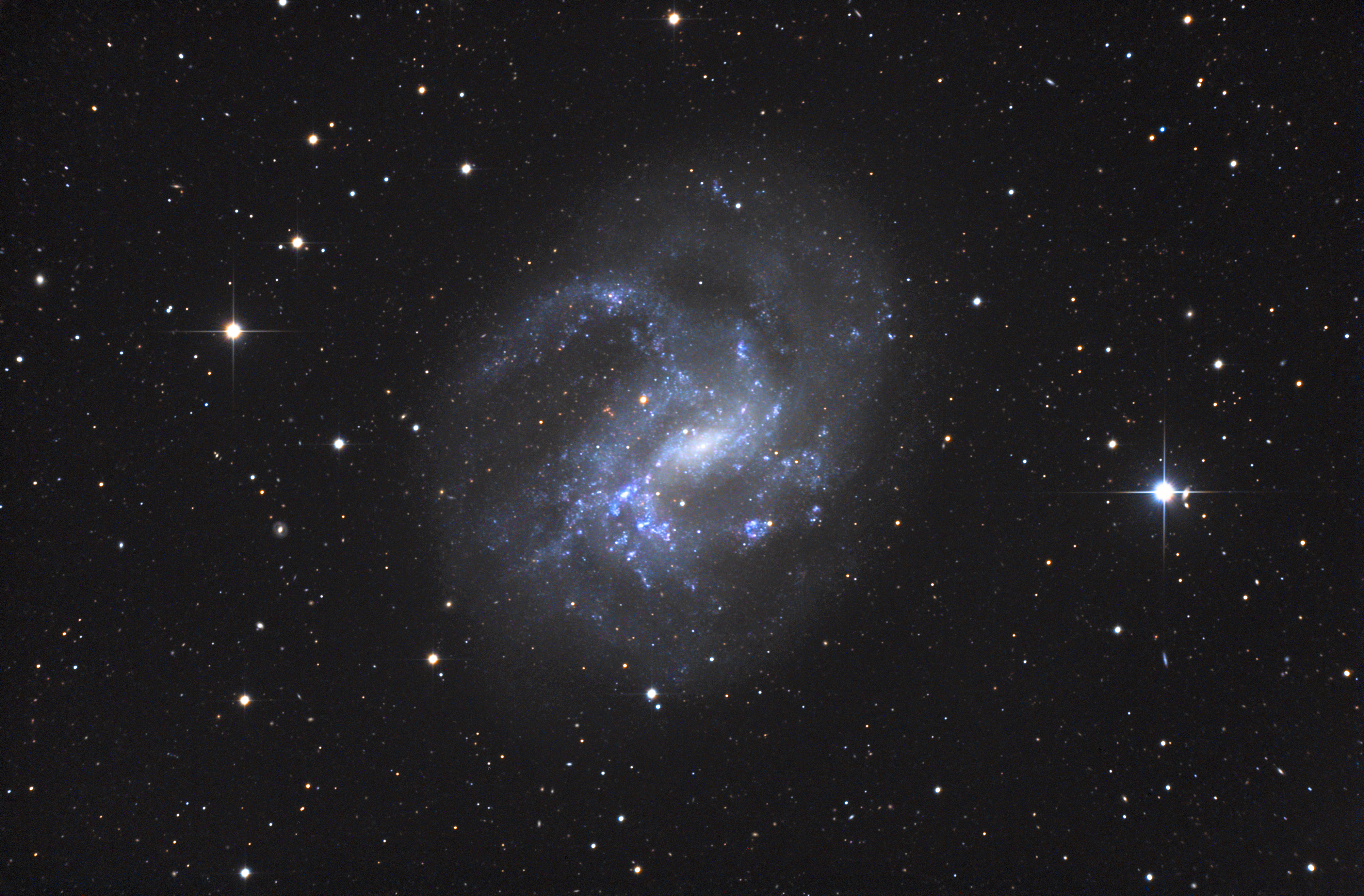 NGC 4395 is a galaxy of the morphological type SAB, an intermediate form from a spiral to a barred spiral. It is a Seyfert 2 galaxy with a bright core but low surface brightness. The brightest of the active star-forming regions have their own NGC numbers. Distances range from 3.9 Mpc to 4.7 Mpc (about 12 to 15 million light years). [145]