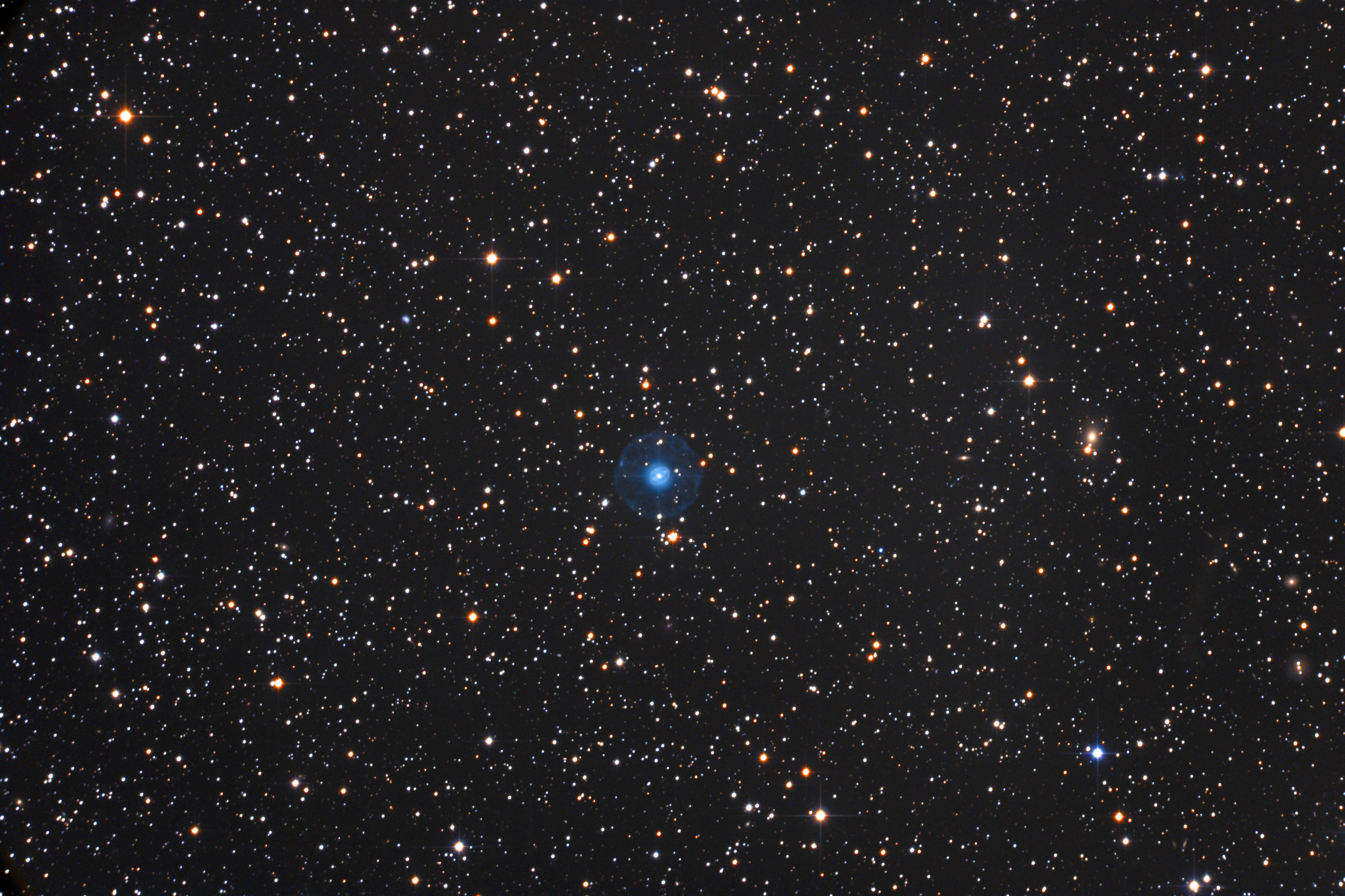 The distance of NGC 6826 is about 2000 to 2200 light years. Like all planetary nebulae, this is the remains of a red giant that has shed its outer layer of gas, leaving a hot, dense white dwarf star at its centre. Our sun will meet the same fate in a few billion years. The most striking feature are two clouds of ionized gas, so-called FLIERS (Fast Low-Ionization Emission Region), which propagate along the axis of symmetry at supersonic speeds. These appear to be of recent date. [187, 196]