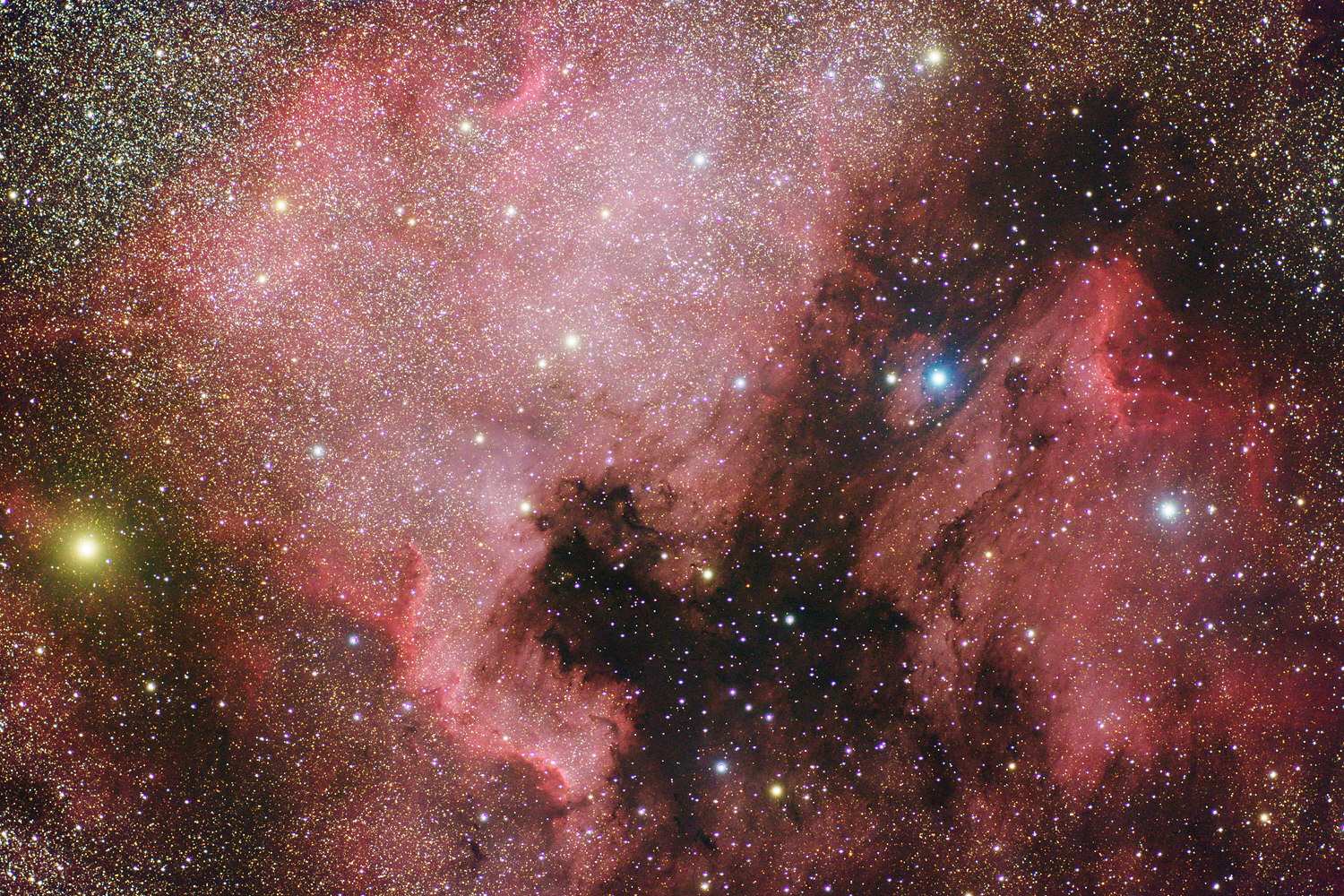 NGC 7000 is a large cloud composed of glowing gas and dark dust. The western portion, which appears separated by a dark cloud, has the designation IC 5070 and is nicknamed the «Pelican Nebula» because it somewhat resembles a seated pelican, holding its long beak to its chest and looking east towards NGC 7000. About 1.5° south of it there is another glowing nebula, which has been given the designation IC 5068.