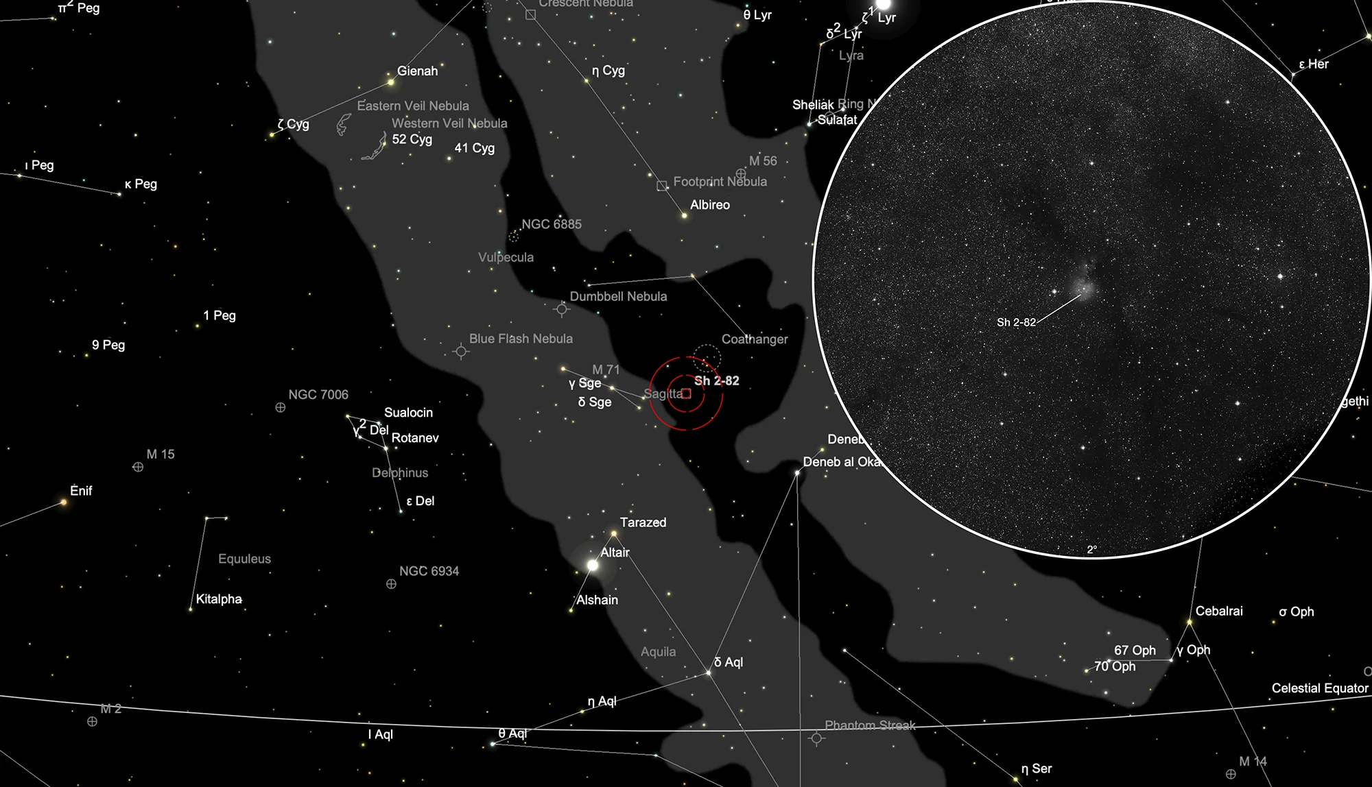 Der Nebel Sharpless 2-82 befindet sich im Sternbild Sagitta. Am 14. Juli steht er in Opposition zur Sonne und kulminiert um Mitternacht Ortszeit.