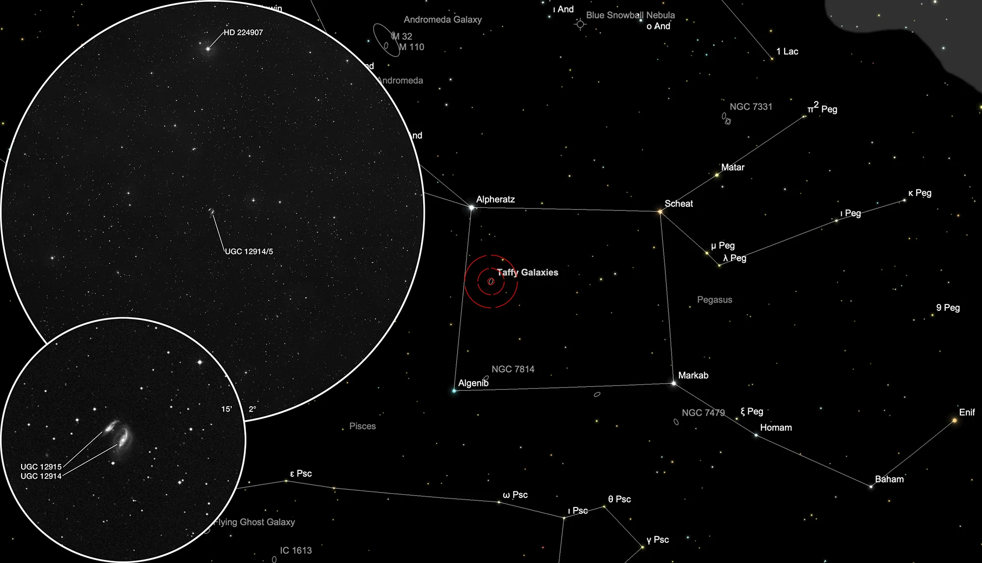 The Taffy Galaxies UGC 12914/5 can be found in the constellation of Pegasus. On 24 September they are in opposition to the Sun and culminates at local midnight.