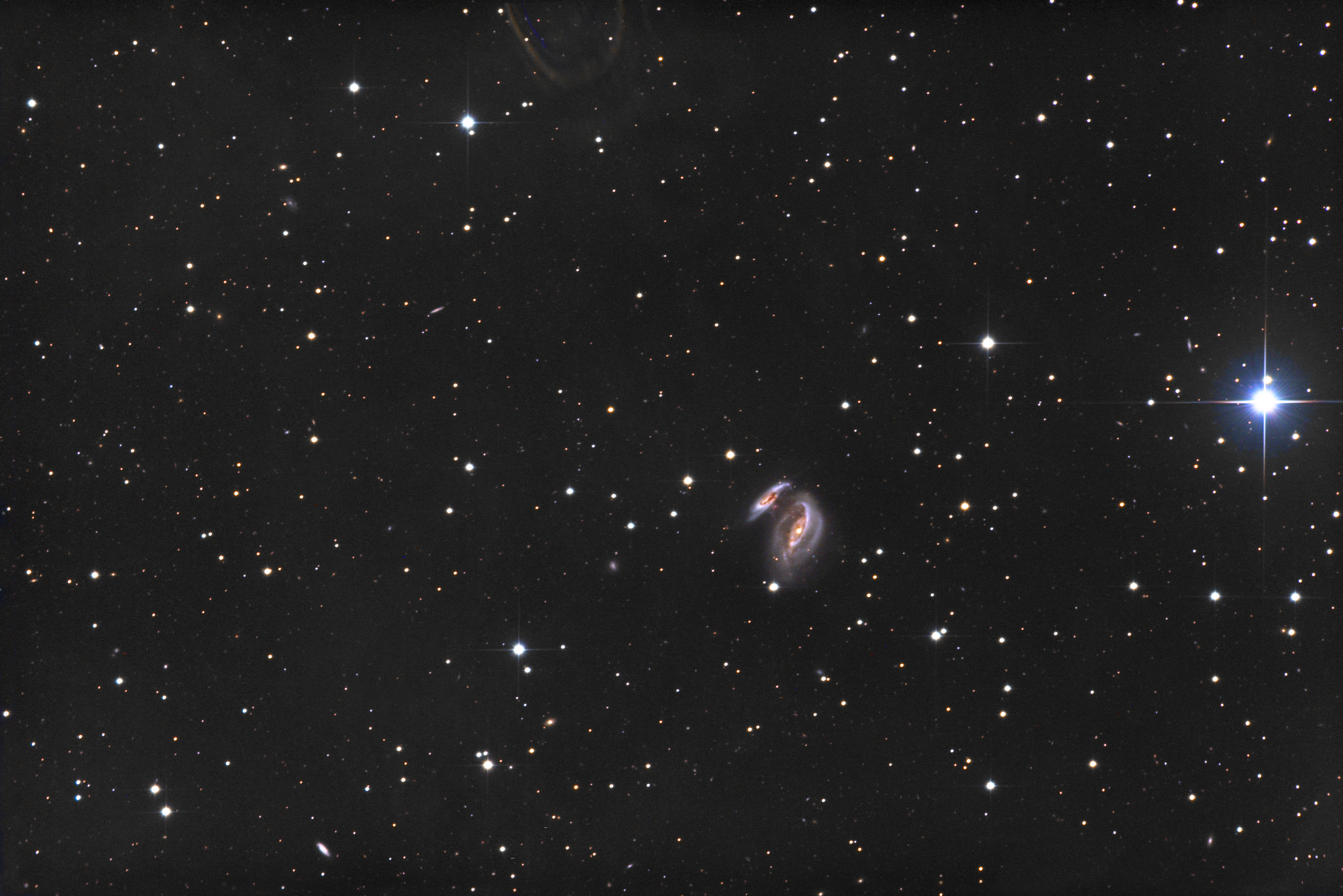The unusual shape of the «Taffy Galaxies» UGC 12914/5 is the result of a head-on collision that occurred about 25 million years ago, which has resulted in a bridge of highly turbulent material spanning the two galaxies. Though this intergalactic bridge is teeming with star-forming material, its turbulent nature is suppressing star formation. The distance to its galaxies is estimated to 180 million light-years. [754]