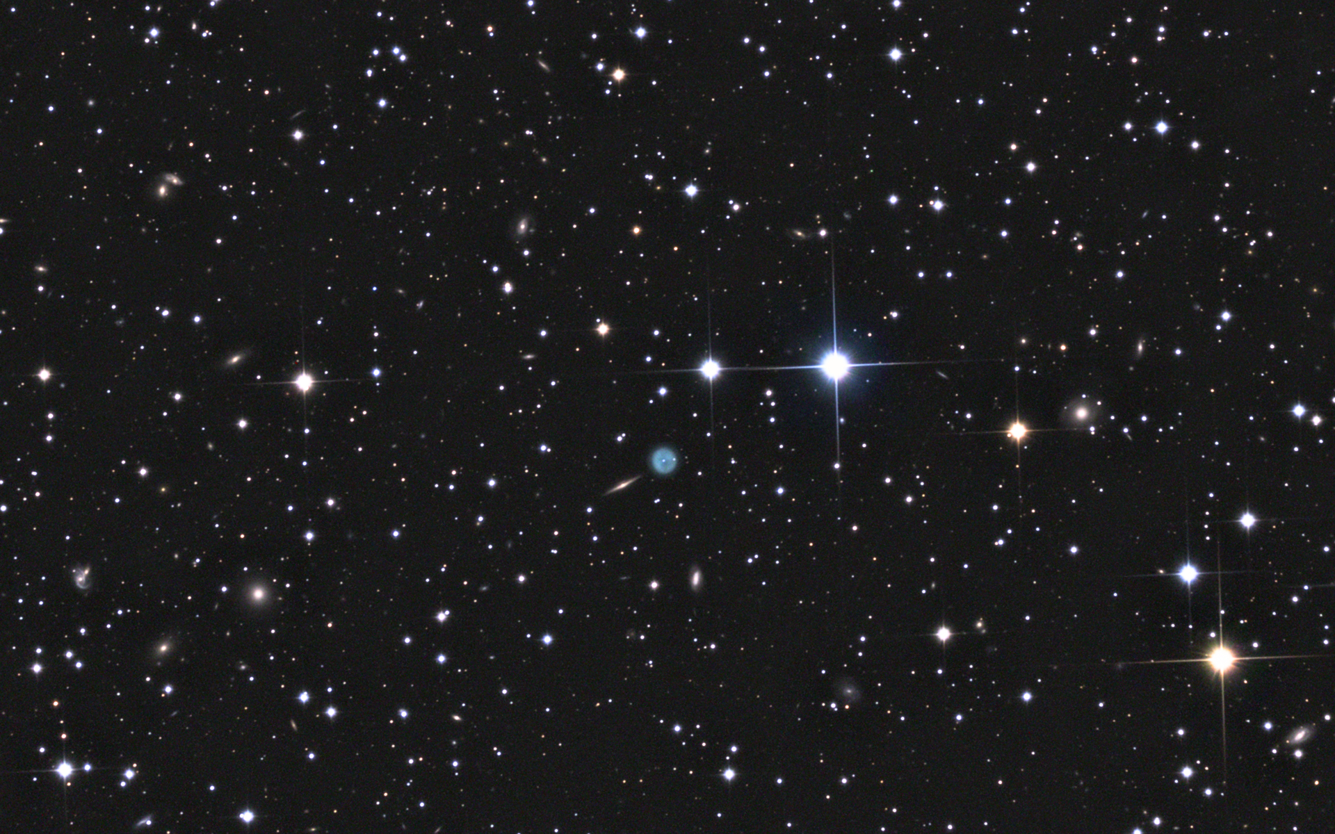 762 mm Öffnung: Im 13 mm Ethos Okular (193-fach) ist der PN deutlich und direkt sichtbar. Von Galaxie gleich daneben ist der nur Kern erkennbar. Den Zentralstern vom PN glaubt man kurz ab und zu aufzublitzen sehen, das war aber wohl eher Einbildung. Bei höherer Vergrößerung im 9 mm Nagler (280-fach) konnte dies nicht bestätigt werden. Evl. lag das an dem eher bescheidenen Seeing in der Nacht. — 30" f/3.3 Slipstream Dobsonian, Hasliberg Reuti, 6. 11. 2021, Bernd Nies