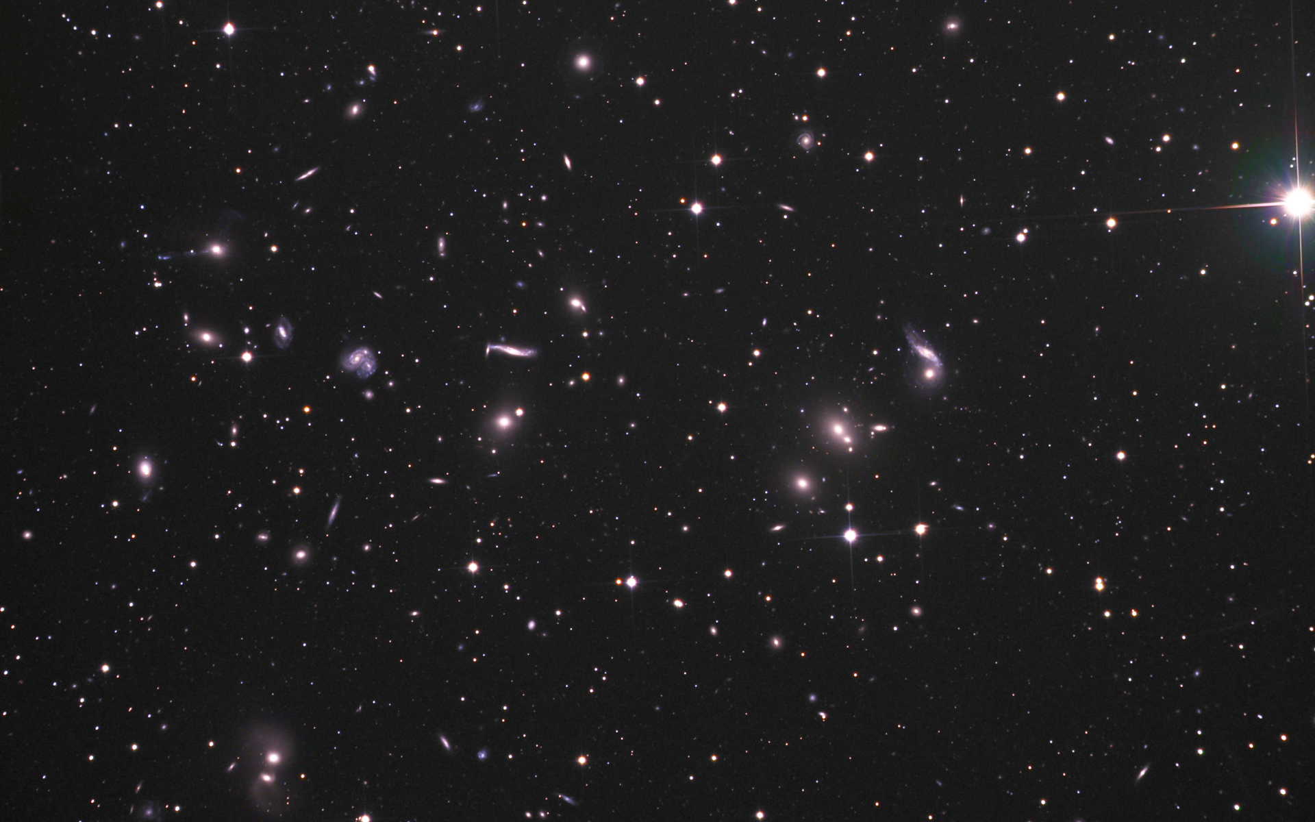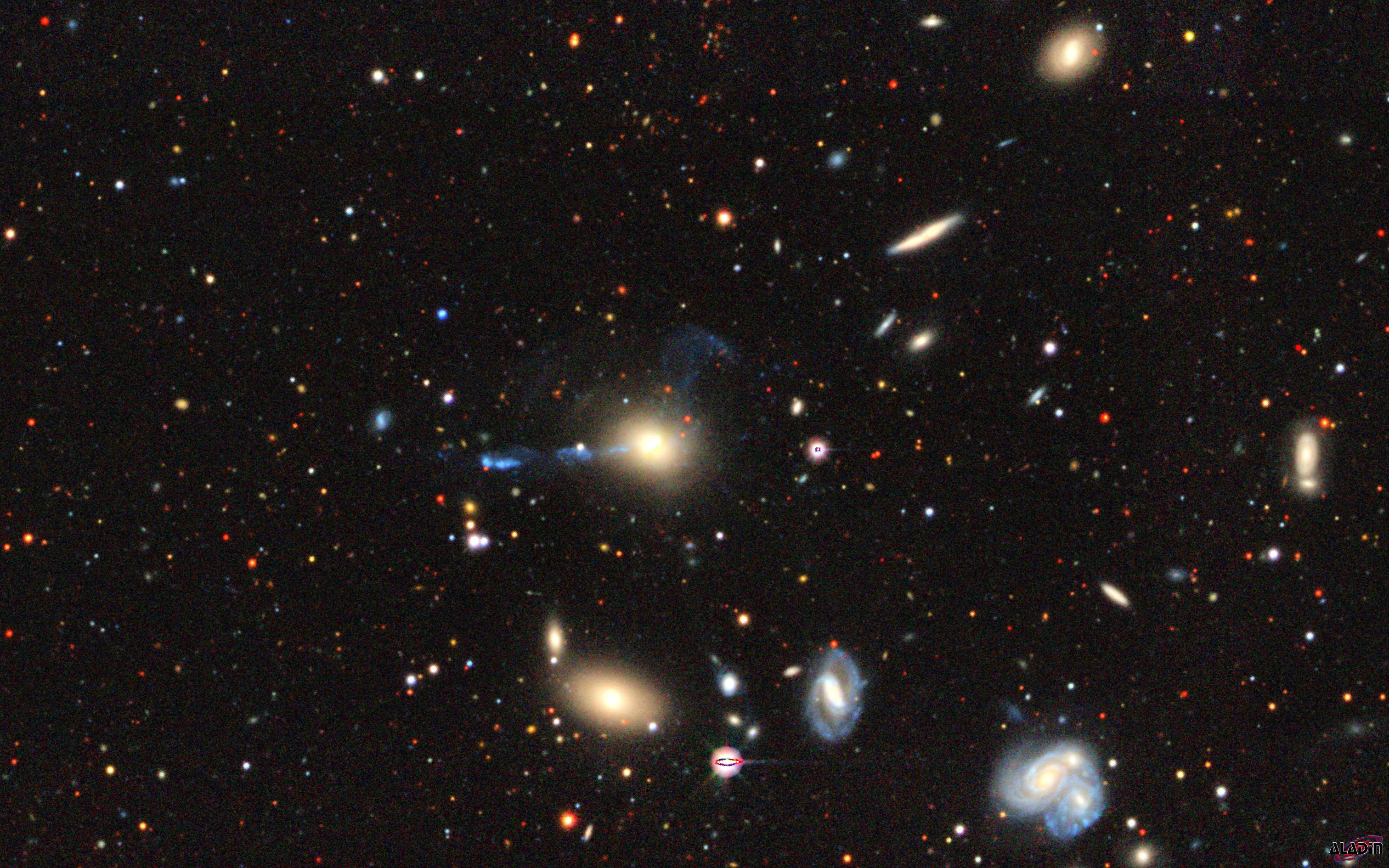 Bemerkenswert unter den Galaxien im Herkules-Galaxienhaufen ist die Galaxie IC 1182, die einen auffälligen Jet zeigt, der sich von ihrem Kern aus nach Osten erstreckt. Dieser Jet besteht aus einer Kette energiereicher Knoten, die vom Zentrum nach außen getrieben werden. Auf der gegenüberliegenden Seite befindet sich eine breite, aber schwächere S-förmige Ausströmung, begleitet von weiterem umgebendem «Trümmermaterial». Das zentrale Gebiet von IC 1182 enthält stark strahlendes Gas und zahlreiche Ansammlungen heißer, blauer Sterne. Zusammengenommen verdeutlichen diese Merkmale die äußerst aktive Natur dieser Galaxie: Sie strahlt große Energiemengen ab und schleudert erhebliche Mengen an Material mit hoher Geschwindigkeit in den umgebenden Raum. Für diese Aktivität wurden verschiedene Erklärungen vorgeschlagen, doch am wahrscheinlichsten ist eine Kollision zwischen zwei Galaxien. [747]