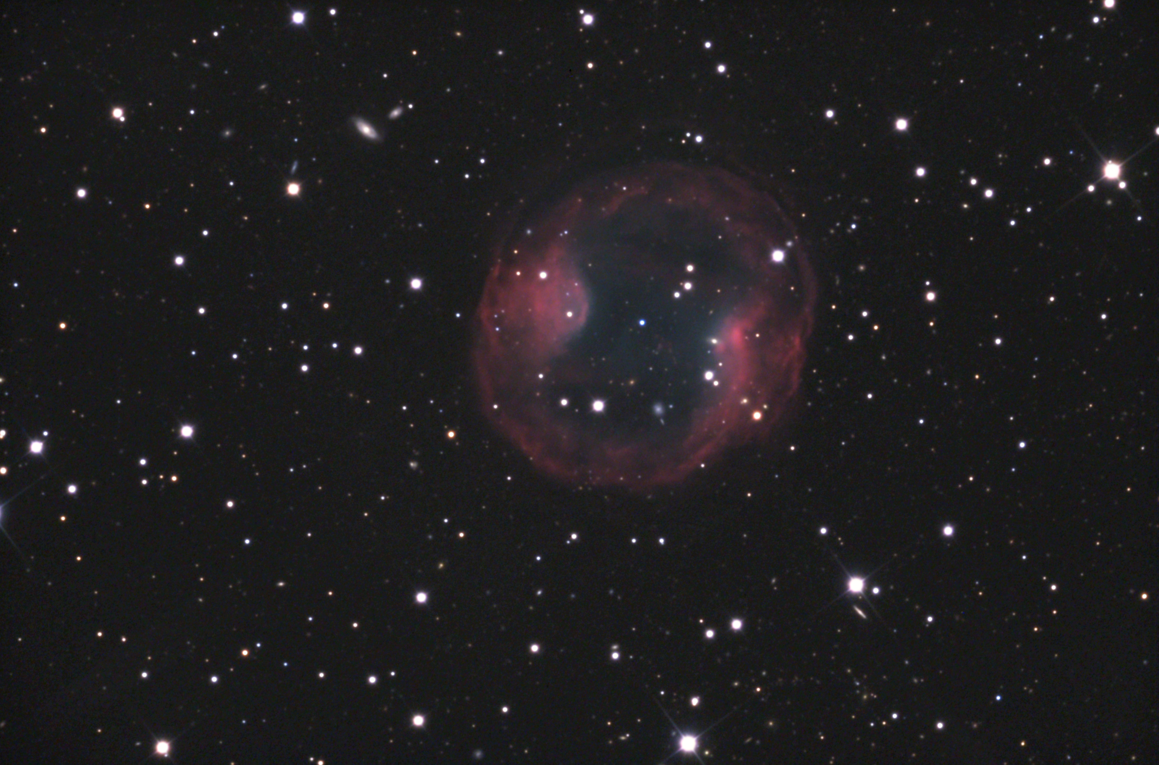 JnEr 1 is a 13,000 year old planetary nebula with an angular diameter of about 380 arc seconds and a low surface brightness. In the centre there is a white dwarf star with 0.63 solar masses and 16.8 magnitudes. The apparent visual brightnes of the nebula is 17.1 magnitudes. The distance is 578 pc (around 1800 light years). [145, 325, 326, 327]