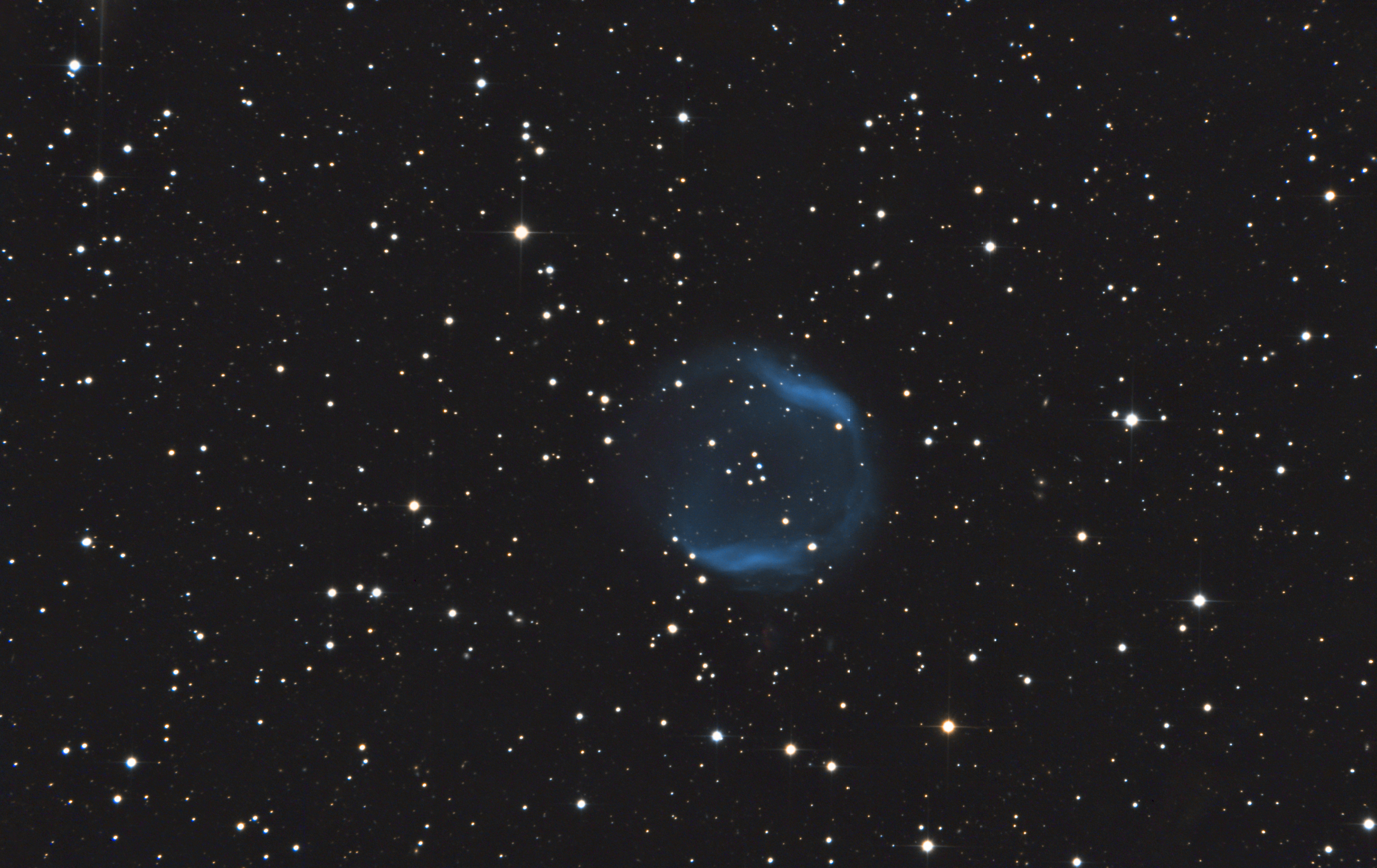 400 mm Aperture: The nebula is very faint in the O-III filter, but directly visible. With averted vision, a bright, subdivided edge and darker interior can be seen. In the H-β filter, as well as without filter, the nebula remains invisible. At slightly higher magnification (16 mm Nagler, 112x) the shape is more clearly defined, but remains very faint. — 400 mm f/4.5 Taurus Dobsonian, Ibergeregg, SQM 21.1, 26. 11. 2022, 21:30, Bernd Nies