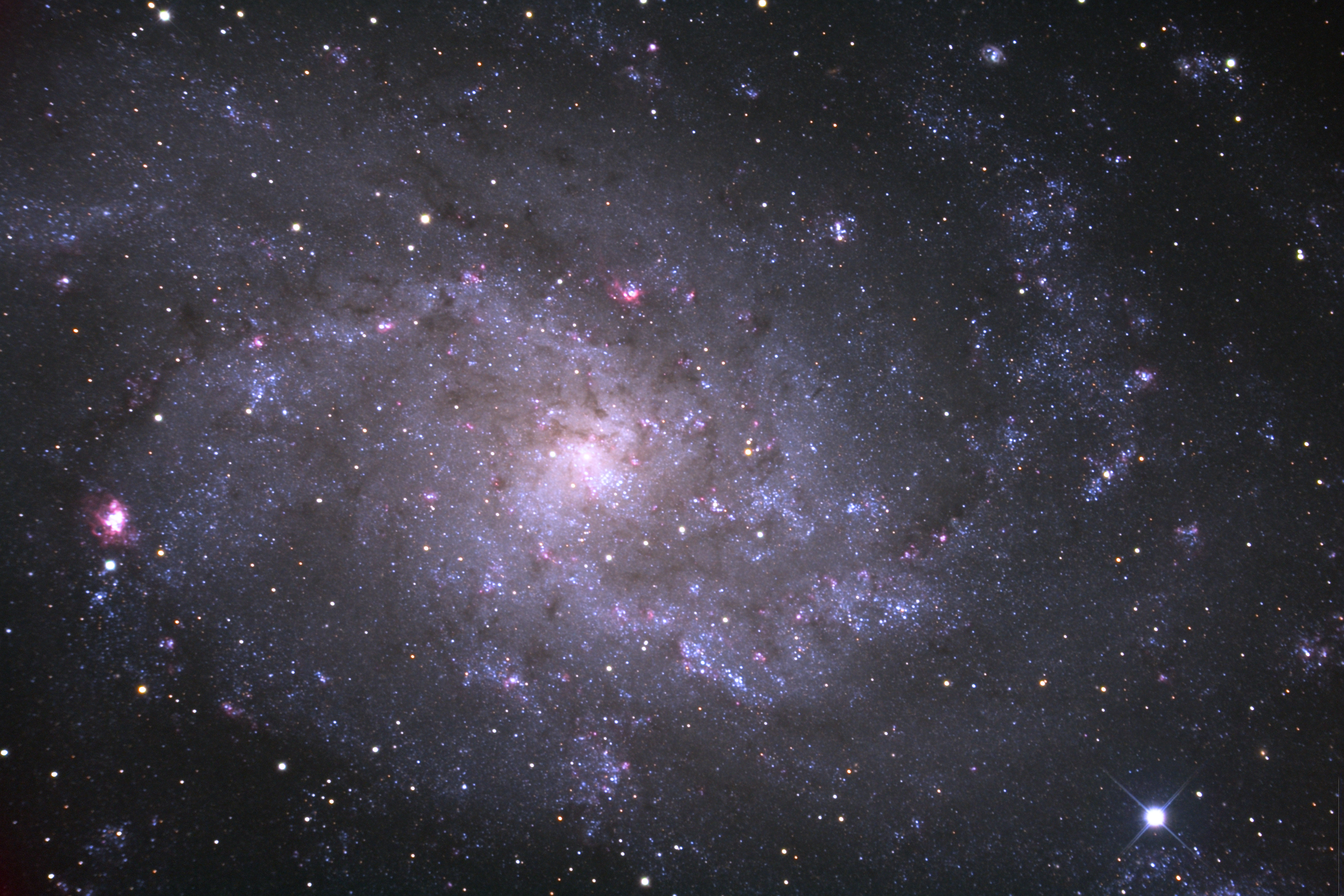 Since the inclination of galaxy M 33 is not as strong as that of the Andromeda Galaxy (M 31), we are looking at the disk at an angle of 54 degrees. Thanks to its close proximity, M 33 offers a large number of extragalactic deep sky objects. About 80 emission nebulae were counted in the spiral arms. The brightest and most distinctive of them have own NGC numbers. The weaker and smaller are listed in the index catalog.