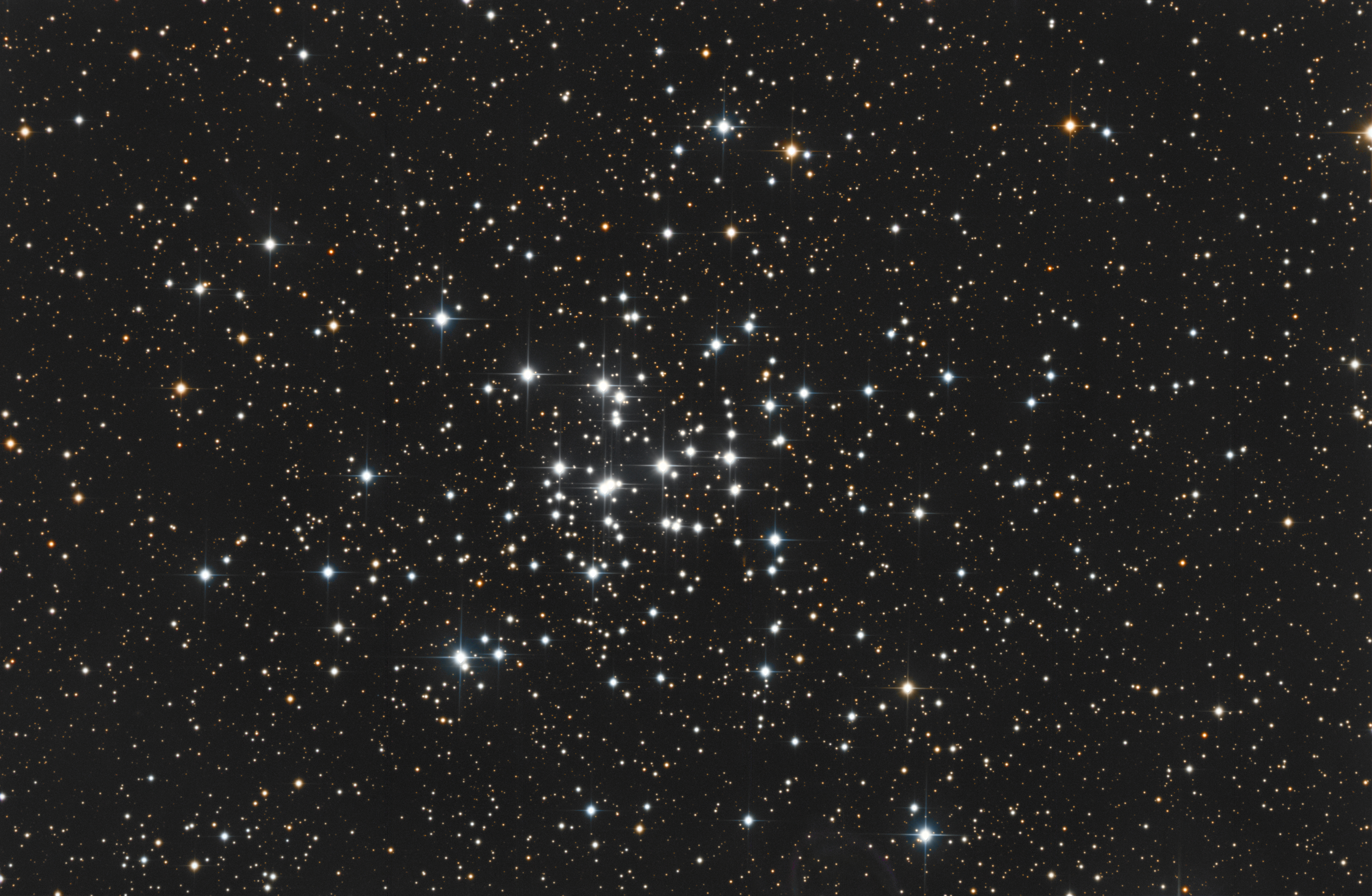 The star cluster is of the Trumpler type II3m and contains about 60 stars from 9th to 14th magnitude. The centre with the brightest stars measures about 10 arc minutes in diameter and contains the binary star Struve 737 (Σ 737, ADS 4194, distance 10.7"). M 36 is one of the younger star clusters with bright B-type stars and no red giants. Measured distances range from 1200 up to 1318 pc. [4, 145]