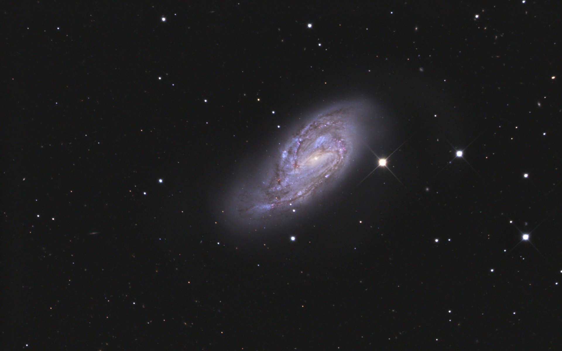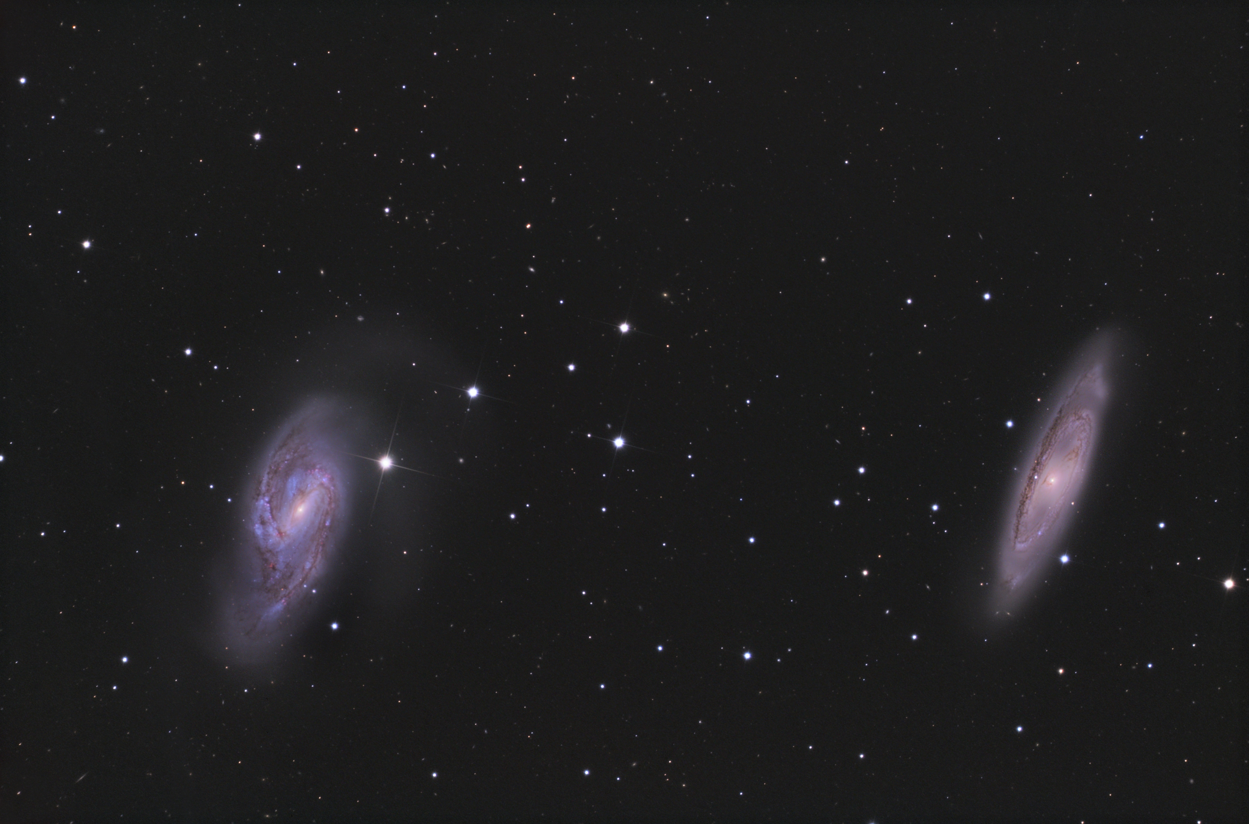 The three galaxies M 65, M 66 and NGC 3628 show gravitational interactions with one another, which mainly influenced the appearance of M 66. The dusty spiral arms are slightly asymmetrical and contain many clusters of bright stars. A weak spiral arm on the north side seems to have already detached itself, which can be seen particularly well in the illustration of the «Sloan Digitized Sky Survey» in Fig. 2. At NGC 3628 we are looking exactly on the edge at a dense band of dust. [196]