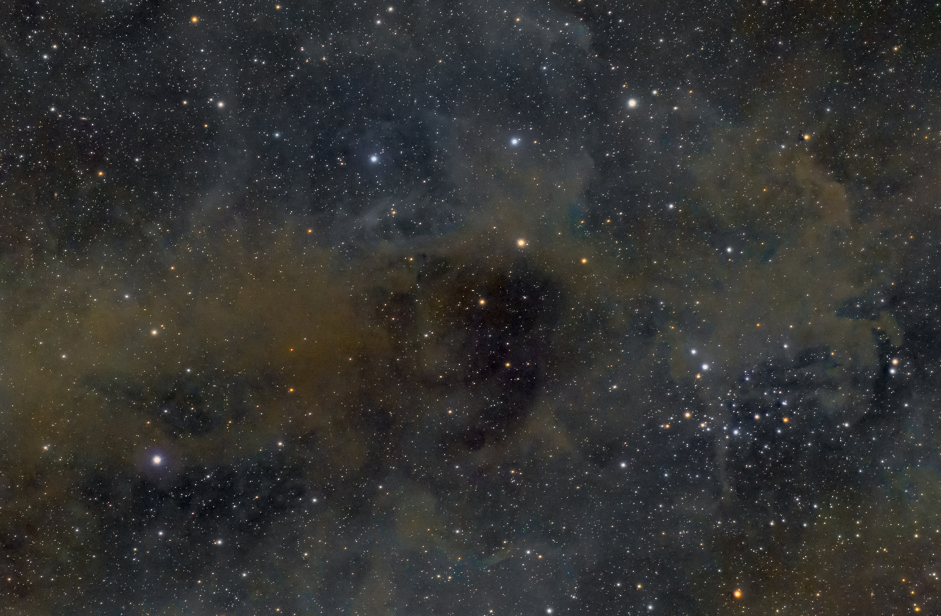 1962 veröffentlichte Beverly T. Lynds ihren «Catalogue of Dark Nebulae», den sie auf Fotoplatten des «National Geographic Palomar Observatory Sky Atlas» erstellte. Östlich des Haufens NGC 1342 identifizierte sie die Nebel LDN 1434. [473] 1965 veröffentlichte sie ihren «Catalogue of Bright Nebulae» und identifizierte LBN 718, LBN 719 und LBN 720 in der Umgebung dieses Haufens. Auf Fotografien sehen ihre dunklen und hellen Nebel jedoch ziemlich gleich aus. [270] LBN 721 ist ein Reflexionsnebel, der 1963 von den deutschen Astronomen Dorschner und Gürtler ebenfalls auf denselben Fotoplatten als DG 19 identifiziert wurde. [594]
