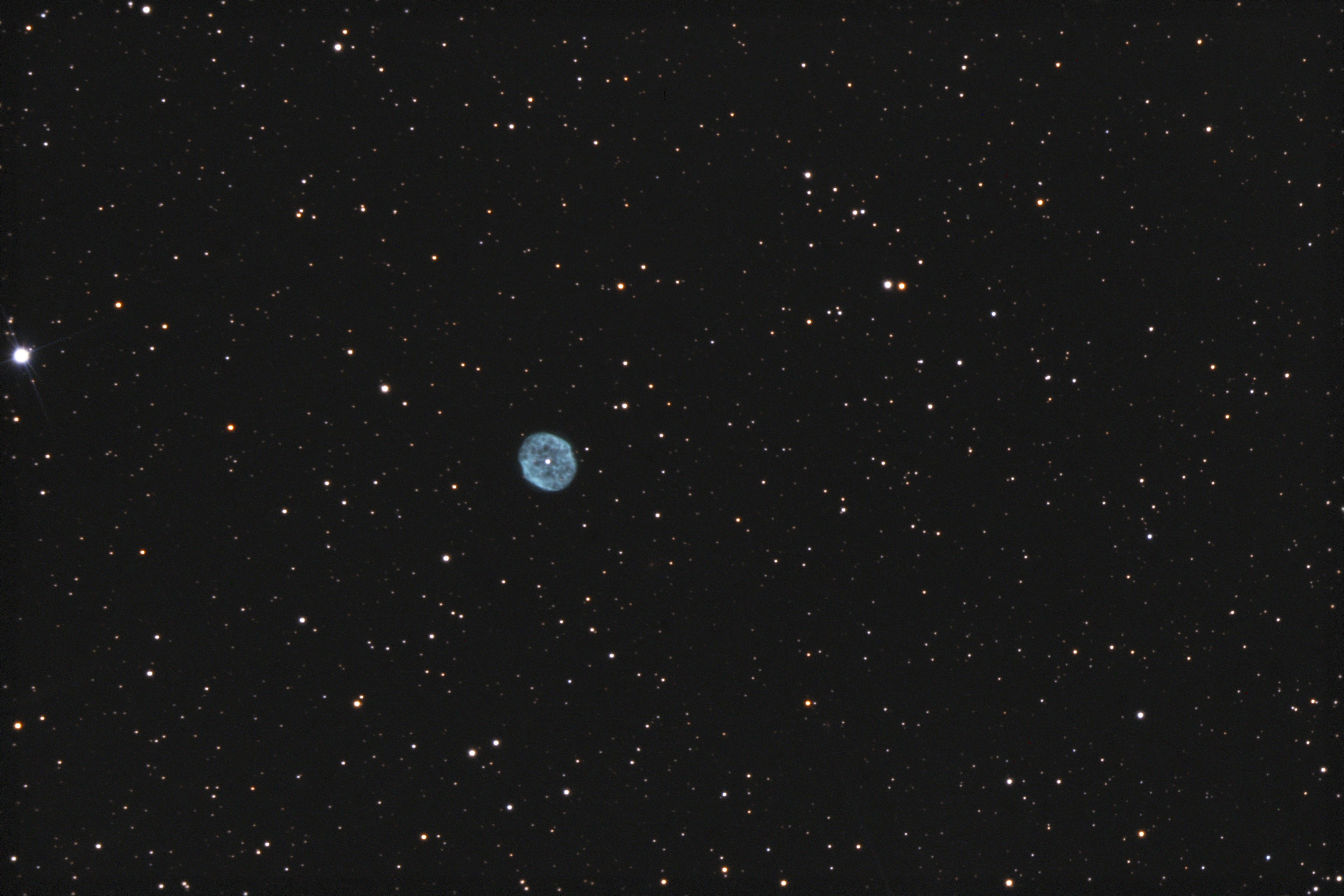 400 mm Öffnung: Im 21 mm Ethos Okular erscheint der PN als auffällige, gleichmäßige Scheibe. Der Zentralstern ist direkt sichtbar. Bei zunehmender Vergrößerung (9 mm Nagler, 6 mm Radian) hebt sich ein hellerer Rand mit dunkleren Stellen im Inneren ab. Mit O-III Filter treten nicht mehr Details hervor. — 400 mm f/4.5 Taurus Dobsonian, Hasliberg, SQM 21.0, 3. 2. 2024, Bernd Nies