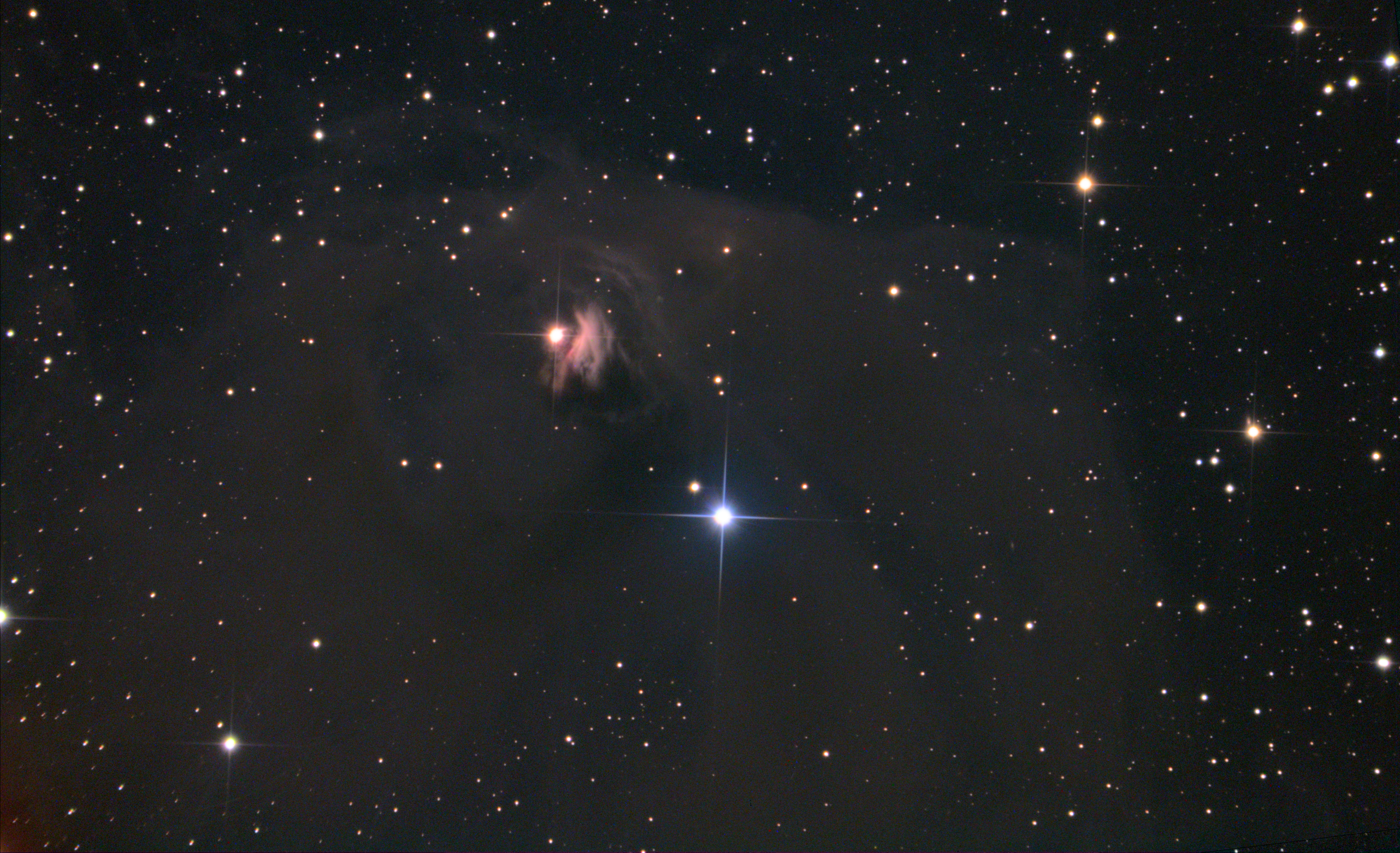 400 mm Öffnung: Selbst bei hoher Vergrößerung ist vom Reflexionsnebel bei T Tauri nichts zu erkennen. — 400 mm f/4.5 Taurus Dobsonian, Hasliberg, 16. 12. 2023, SQM 21.2, Bernd Nies
