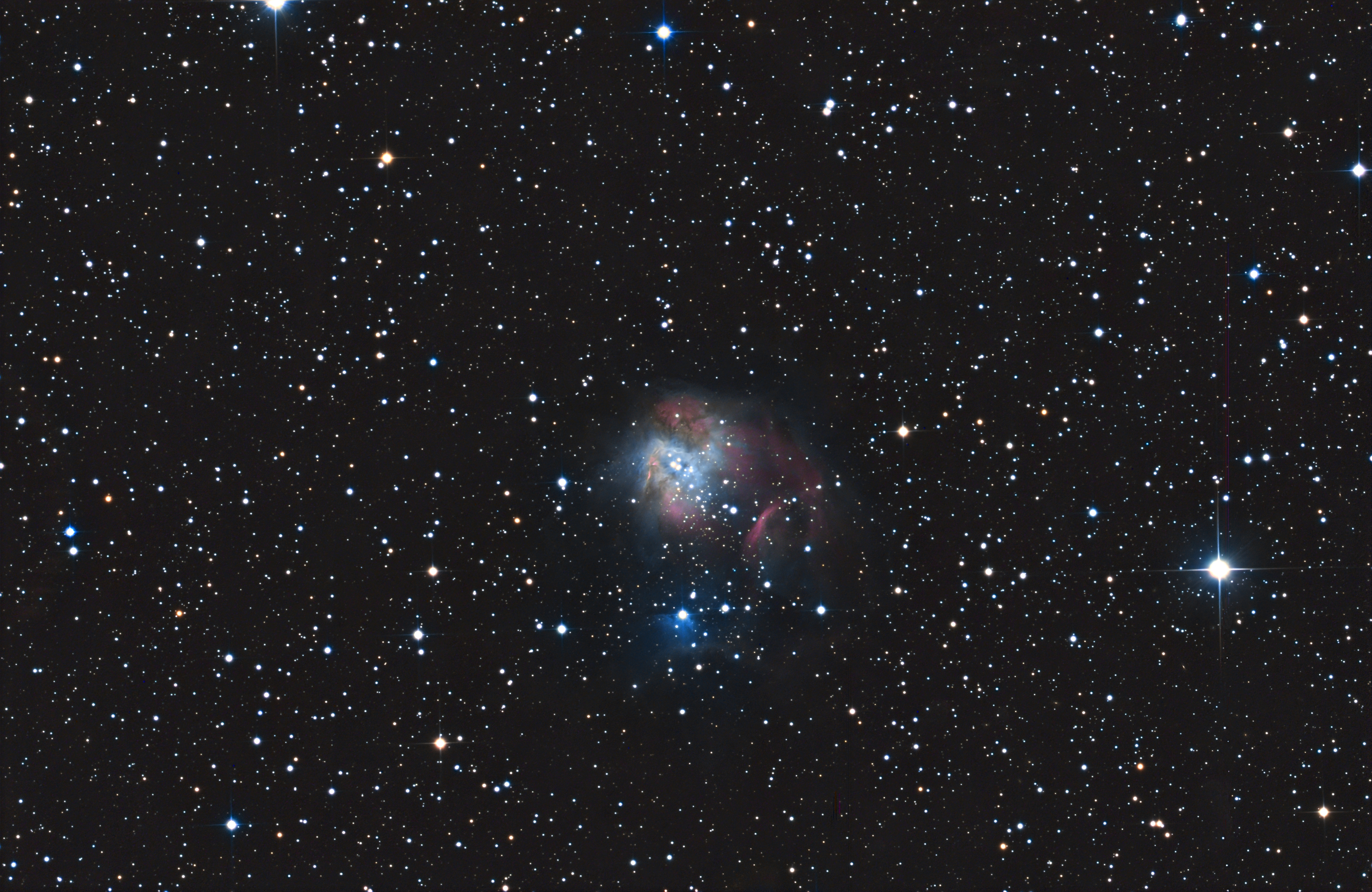 NGC 1931 wurde am 4. Februar 1793 von Wilhelm Herschel entdeckt. Es handelt sich um einen jungen Sternhaufen, umgeben von einem Nebel aus Gas und Staub und besitzt teils amorphe, teils aber auch eine filamentartige Struktur. Der Staubnebel umgibt eine kleine Gruppe von schwachen Sternen. Er gleicht einer Miniaturausgabe des Orionnebels und befindet sich im einem Spiralarm der Milchstrasse, welcher vermutlich eine Verlängerung des Perseus-Arms ist. Distanzangaben variieren von 1.8 pkc bis 2.16 kpc (5870 bis 7050 Lichtjahre). Der Nebel hat eine Winkelausdehnung von 4'x4' und einer integrierten Helligkeit von 11.3 mag. [196, 219]