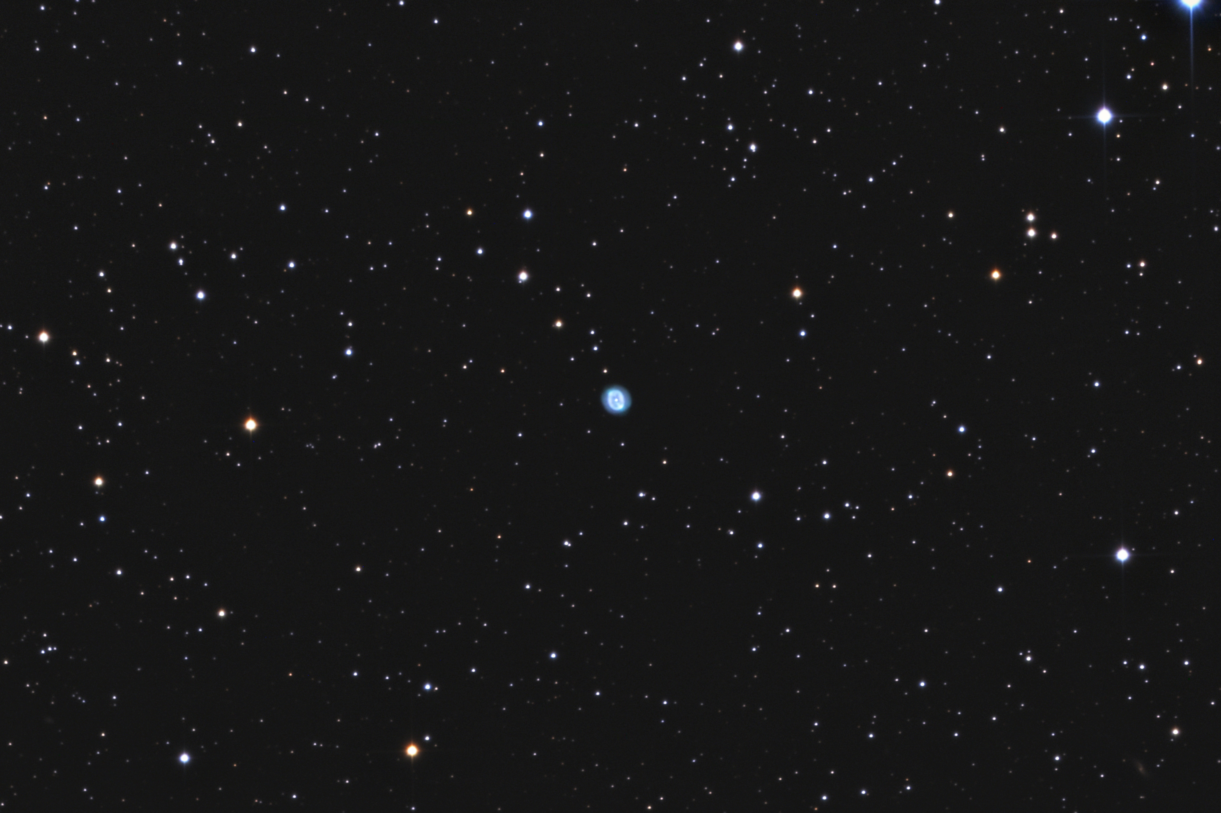 300 mm aperture: Here the nebula already looks less even. A slight elongation is visible at position angle 15 degrees, the extent of the structure is 25" x 20". There are bright points at the two outer ends of the ring, with the southern one appearing more conspicuous. At 450x magnification, the nebula is clearly ring-shaped but still lacks a central star.