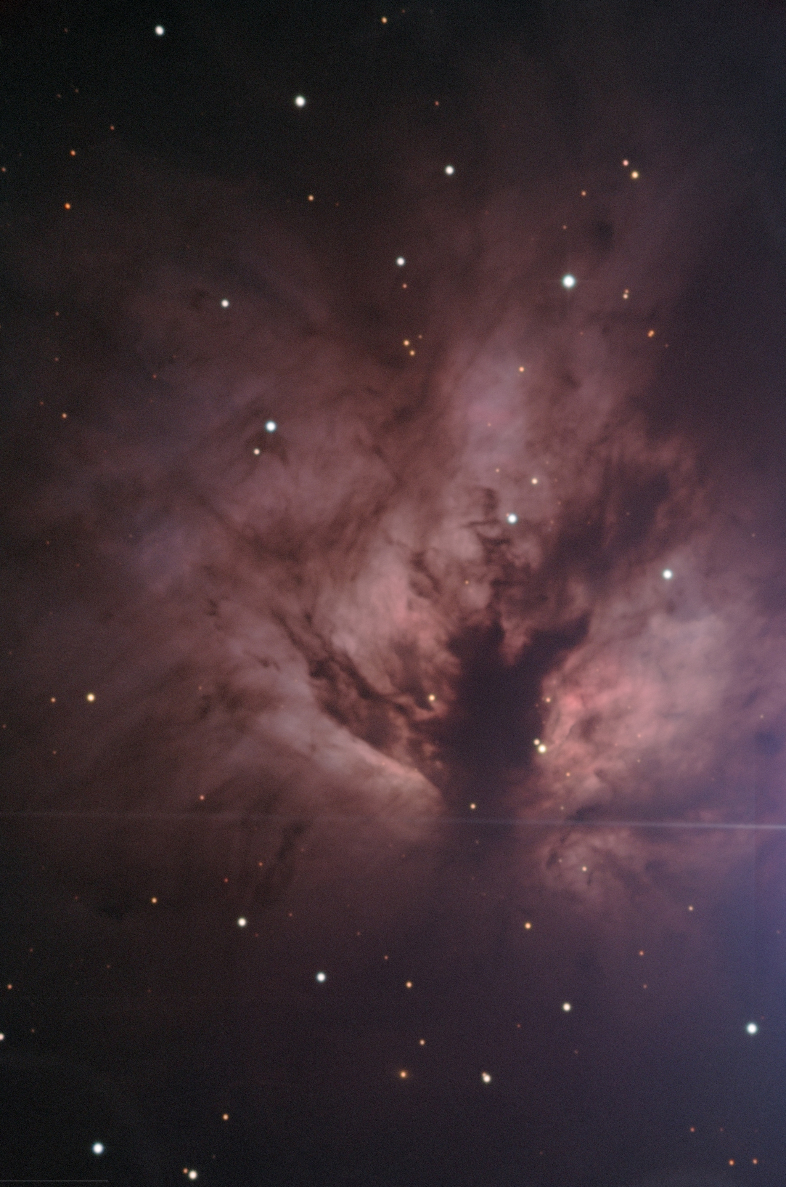 150 mm Öffnung: Obwohl Alnitak bei der Suche nach NGC 2024 sehr zuvorkommend ist, stört er jedoch, wenn man den Nebel beobachten will. Trotzdem lohnt sich eine Beobachtung immer wieder. Dieser Nebel gehört zu den Objekten, die eine deutliche Struktur in Form und Helligkeitsunterschieden zeigen. Auch neben dem grossen Orion- und Pferdekopfnebel lohnt sich ein Abstecher immer wieder. Um das störend helle Licht von Alnitak beim Anfertigen dieser Zeichnung abzuschwächen, wurde mittels eines dünen Klebebandstreifens eine einfache Maske gefertigt, die auf die Blende eines 35 mm Weitwinkelokuares geklebt, wertvolle Dienste leistete. Damit liess sich der hellen Stern abdecken, wobei der ganze Aufwand weniger als eine Minute in Anspruch nahm. Der Nebel liess sich so entspannter Beobachten und mehr Details kamen zum Vorschein. Filter brachten keinen nennenswerten Gewinn - saubere und trockene Luft ist wegen des überstrahlenden Sterns aber Voraussetzung für eine erfolgreiche Detailbeobachtung. Die visuelle Beobachtung zeigt sehr schön die helleren Bereiche, die durch längs verlaufenden dünkleren Bänder unterteilt sind. Der Nebel hat deshalb spontan die Bezeichnung «Blumenkohlnebel» erhalten, da er irgendwie an die Struktur eines Länsschnittes dieses Gemüses erinnert. Bekannter dürfte jedoch die Bezeichnung «Flaming Tree Nebula» (brennender Baum) sein. In der Tat kann man darin die Siluette eines Stammes und der grossen Äste erkennen, die im hellen Feuer stehen. — 150 mm f/15 Lichtenknecker ED Refraktor, 1996, Beat Kohler