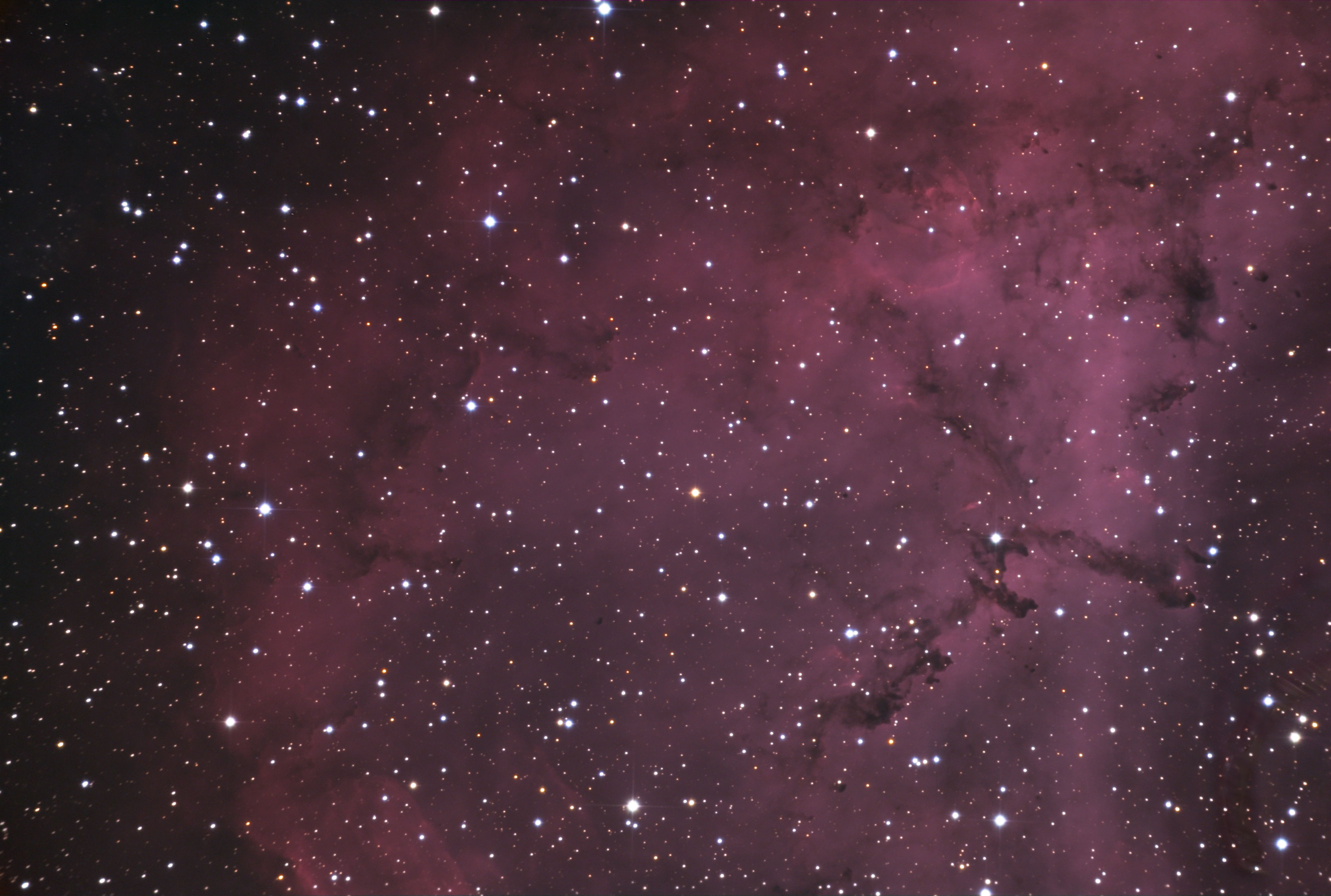 The Rosette Nebula is an H-II region, a star-forming region with clouds of gas and dust. At a distance of about 5000 to 5200 light-years and a diameter of 130 light-years, it appears relatively large in the sky, about 80 x 60 arc minutes. The mass of the nebula is estimated at around 10'000 solar masses. [196]