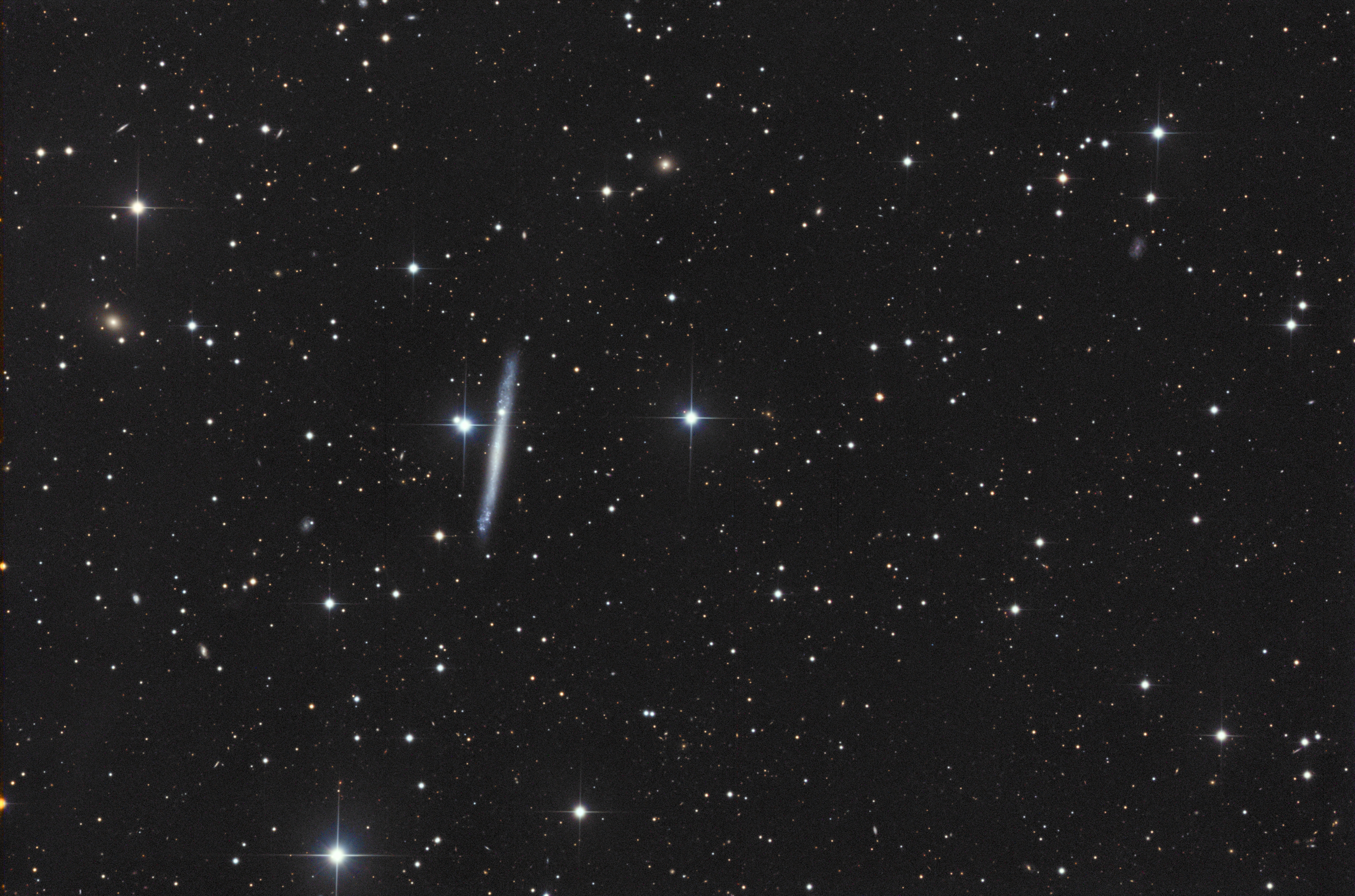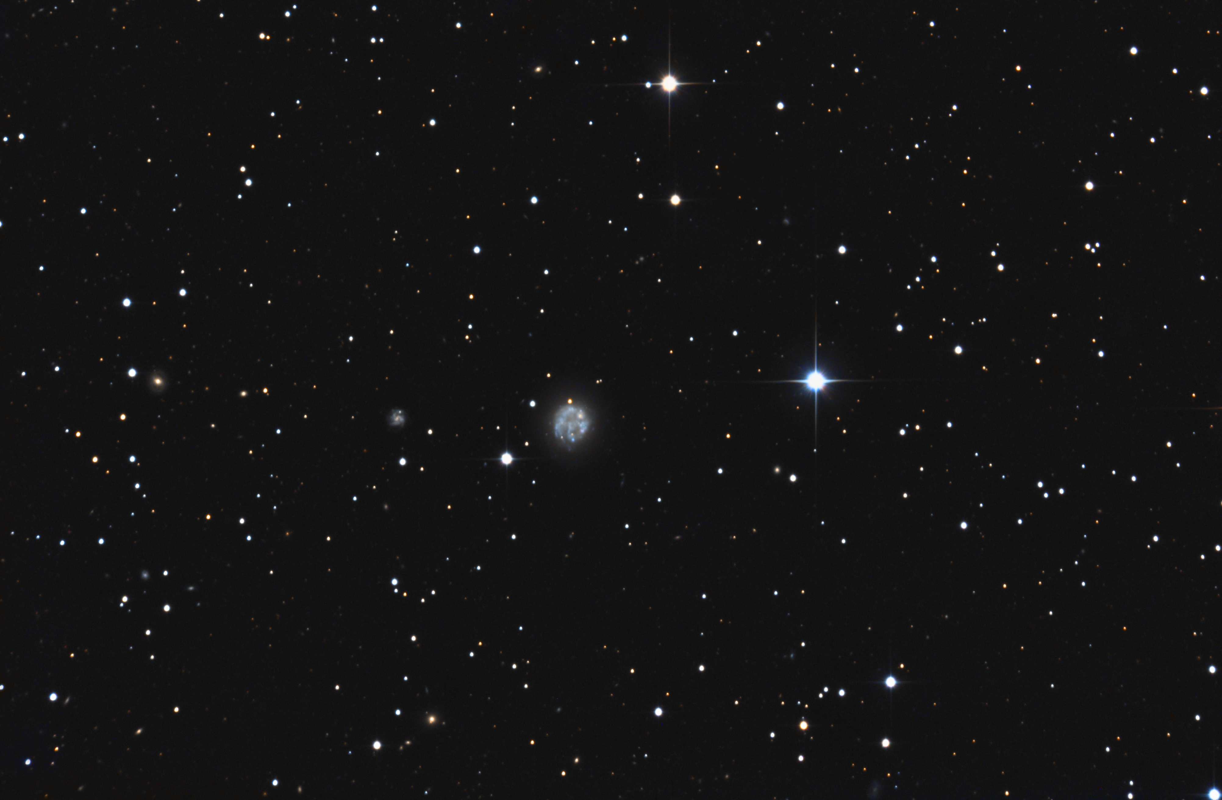 NGC 2537 ist eine kompakte blaue Zwerggalaxie mit einer Rotverschiebung von z=0.001491. Laut Simbad reichen die geschätzten Entfernungen von 6,9 bis 15 Mpc. Die kleine Spiralgalaxie NGC 2537A (MCG+08-15-051) vier Bogenminuten weiter östlich weist eine Rotverschiebung von z=0.04001 auf und ist damit viel weiter entfernt und nicht mit ihrem optischen Nachbarn assoziiert. [145, 582]