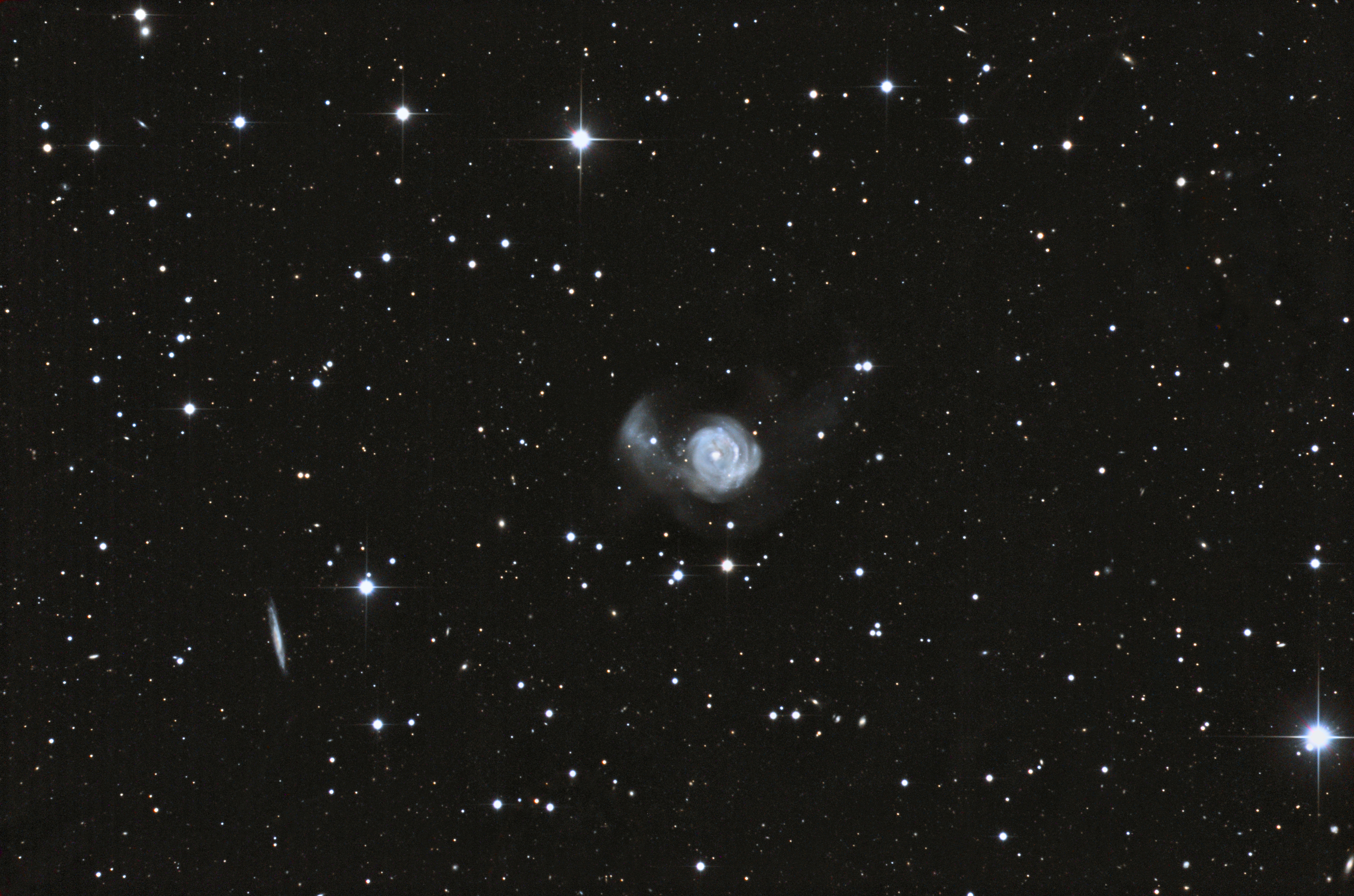 NGC 2782 ist eine Seyfert 2 Galaxie vom morphologischen Typ S_AB. Die eigentümliche Form geht auf eine Verschmelzung mit einer kleineren Galaxie von etwa einem Viertel der Masse hervor. Man schätzt, dass dies vor etwa 200 Millionen Jahren stattfand. Diese Verschmelzung produzierte zwei Gezeitenarmen, welche reich an H-I sind. [519] Bei einer Rotverschiebung von z=0.008503 reichen die geschätzten Entfernungen von 38.6 bis 41.7 Mpc. Die kleine Galaxie UGC 4872 in Kantenlage weist eine Rotverschiebung von z=0.02744 und befindet sich mit einer Entfernung von 119 Mpc viel weiter weg. [145]