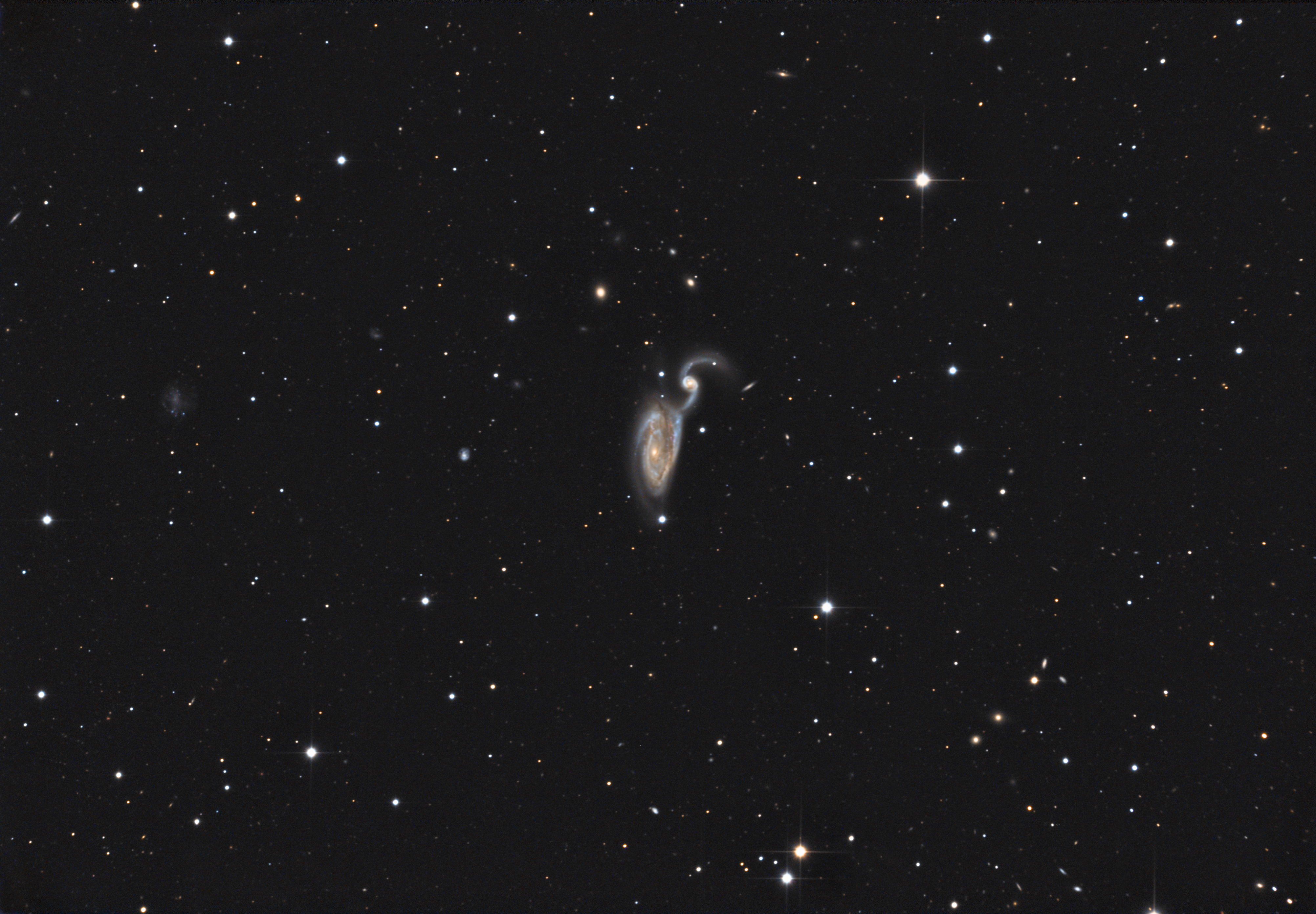 NGC 5395 is a Seyfert Type II spiral galaxy. It is interacting with the smaller companion NGC 5354 which shows two open tidal arms and also starburst activity in its centre region. This could be the result of a past collision, which was shown with model calculations. Distances to the galaxy pair NGC 5394/5 range from 50 Mpc to 54 Mpc (163 bis 178 million light-years). The larger galaxy (NGC 5395) is 140'000 light-years across and the smaller one (NGC 5394) is 90'000 light-years across. [145, 506, 507]