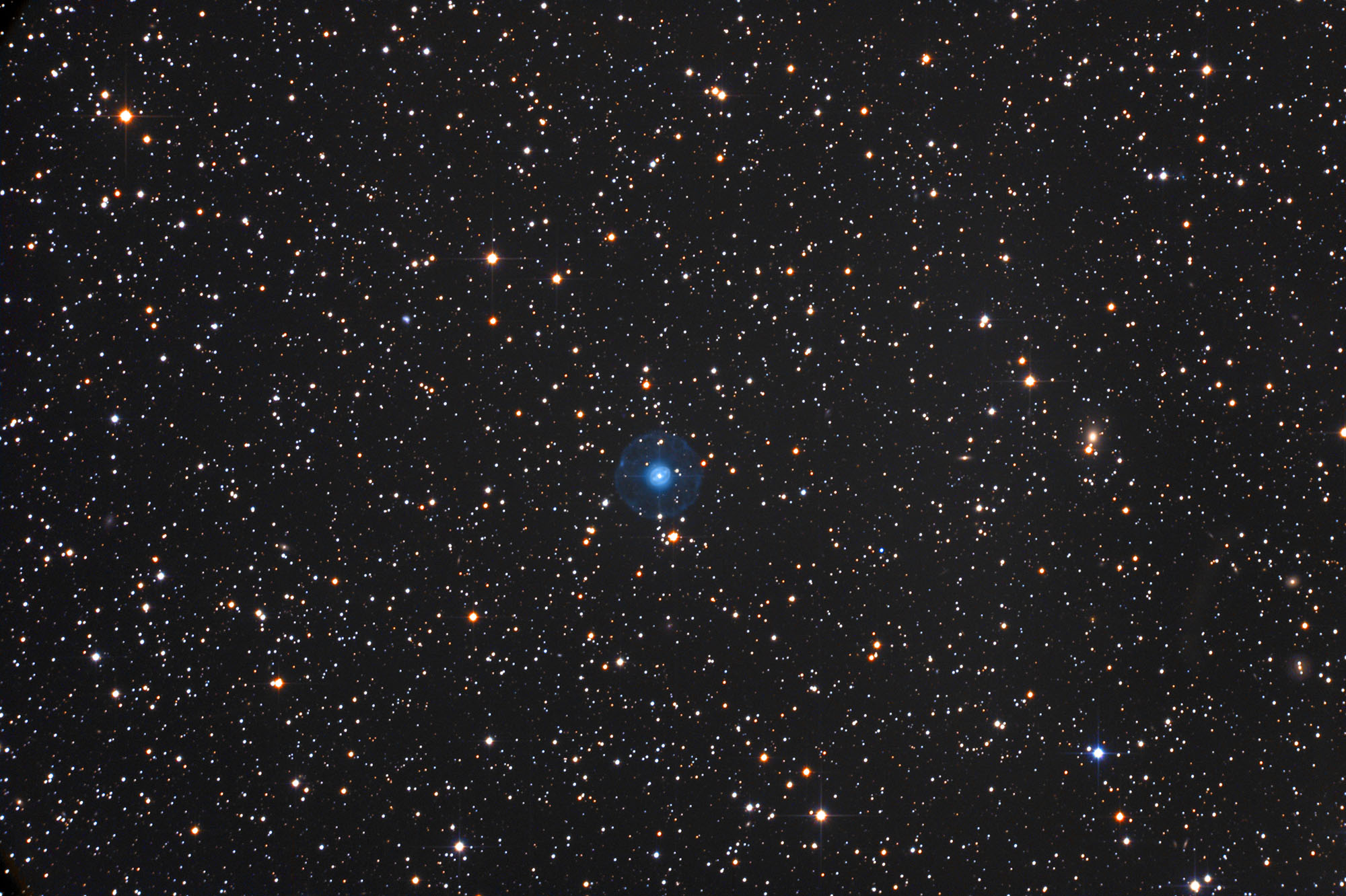 The distance of NGC 6826 is about 2000 to 2200 light years. Like all planetary nebulae, this is the remains of a red giant that has shed its outer layer of gas, leaving a hot, dense white dwarf star at its centre. Our sun will meet the same fate in a few billion years. The most striking feature are two clouds of ionized gas, so-called FLIERS (Fast Low-Ionization Emission Region), which propagate along the axis of symmetry at supersonic speeds. These appear to be of recent date. [187, 196]