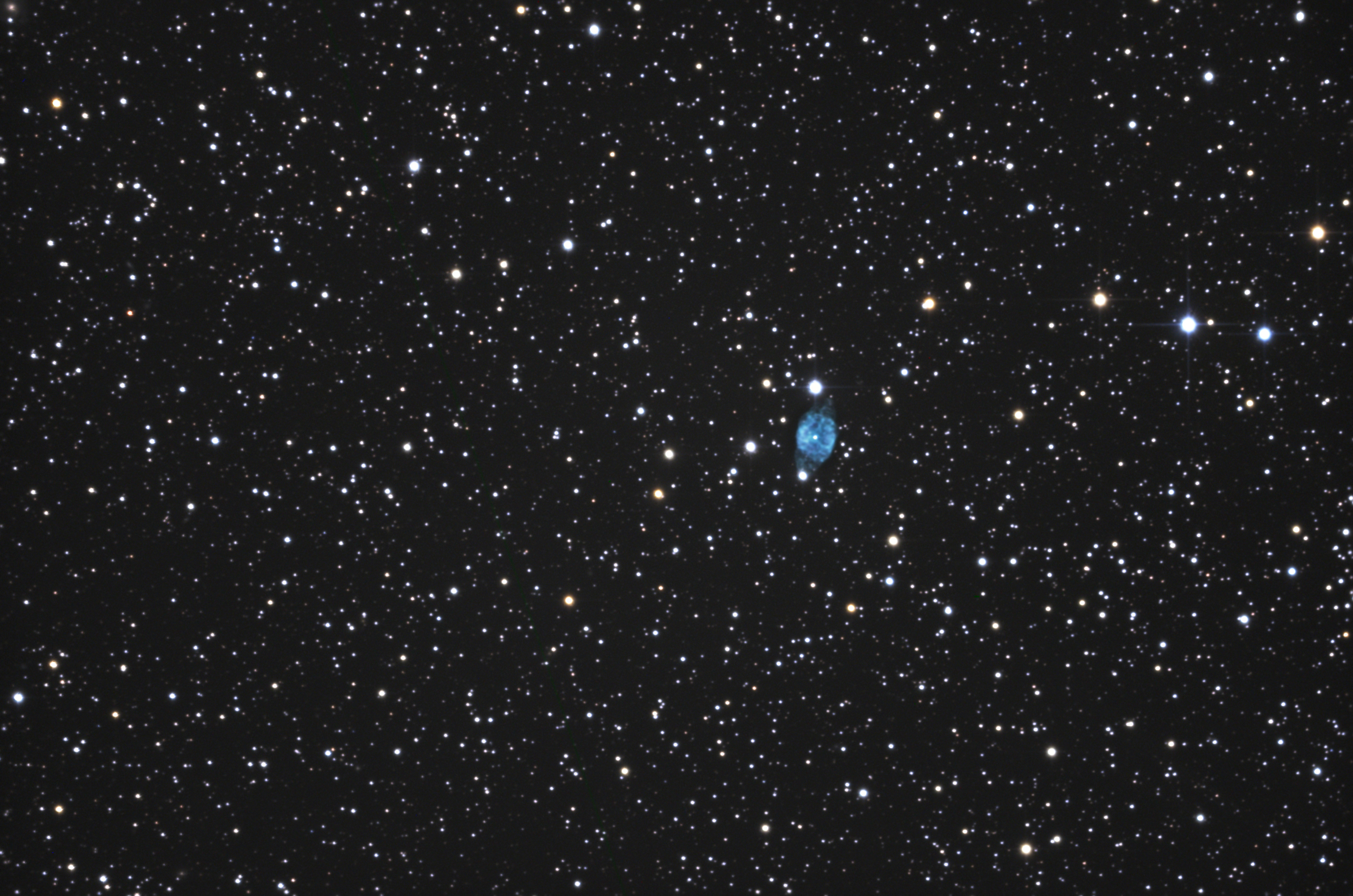 400 mm Aperture: In the 21 mm Tele Vue Ethos eyepiece, the planetary nebula is already visible quite well without an O-III filter. In the 9 mm Nagler eyepiece, the central star becomes apparent, and the fact that the edge is slightly brighter is also noticeable. The nebula appears round. The two faint lobes are not discernible. — 400 mm f/4.5 Taurus Dobsonian, Glaubenberg, SQM 21.0, 11. 10. 2023, Bernd Nies