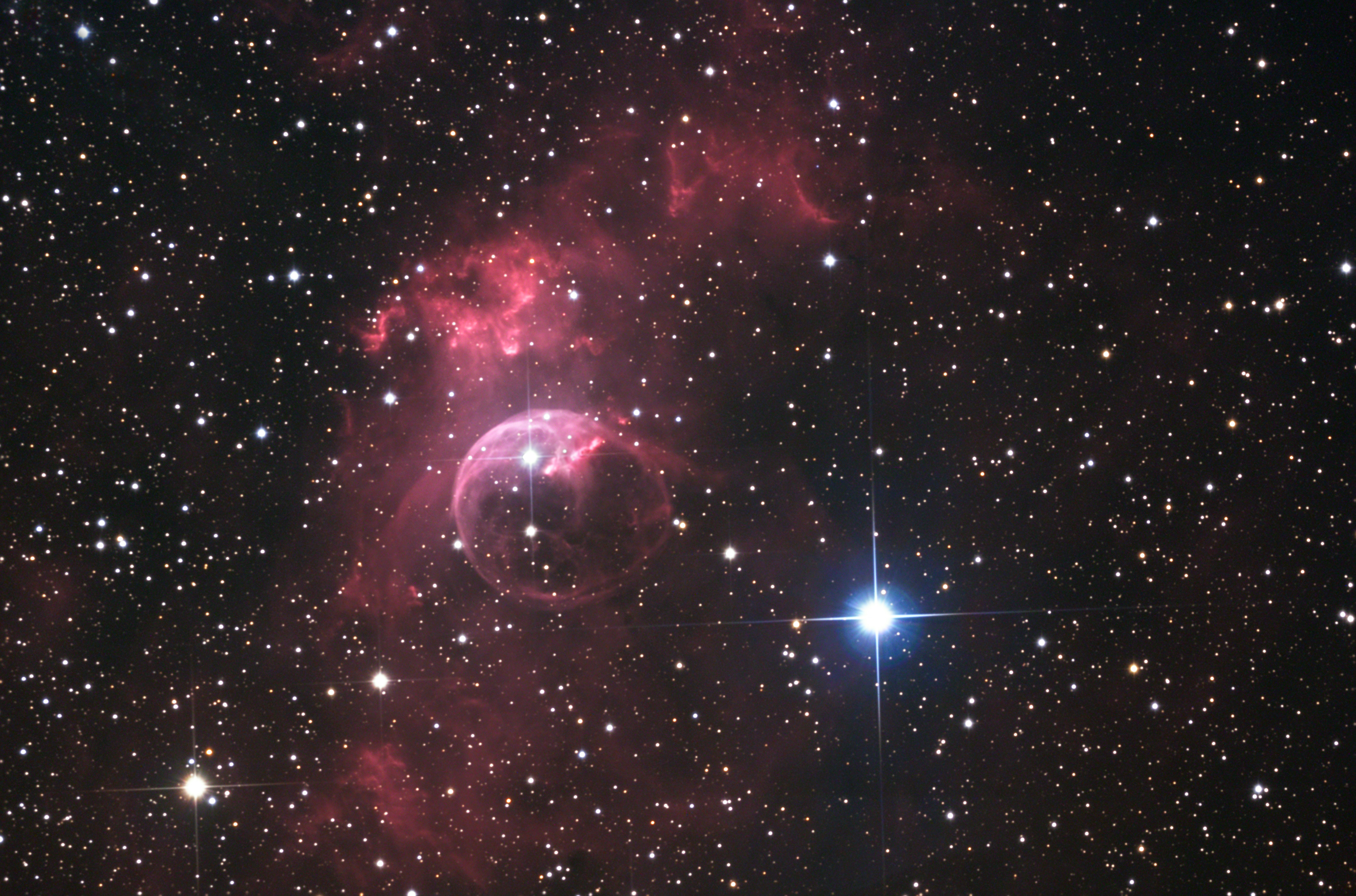762 mm Öffnung: Der Blasennebel NGC 7635 erscheint «rechts» als sich bis zu einem feinen Stern erstreckenden Mondsichel, wobei der linke Teil der Sichel viel fetter als der rechte spitz auslaufende ist. — 30" f/3.3 Slipstream Dobsonian, Hasliberg Reuti, 3. 3. 2022, Eduard von Bergen