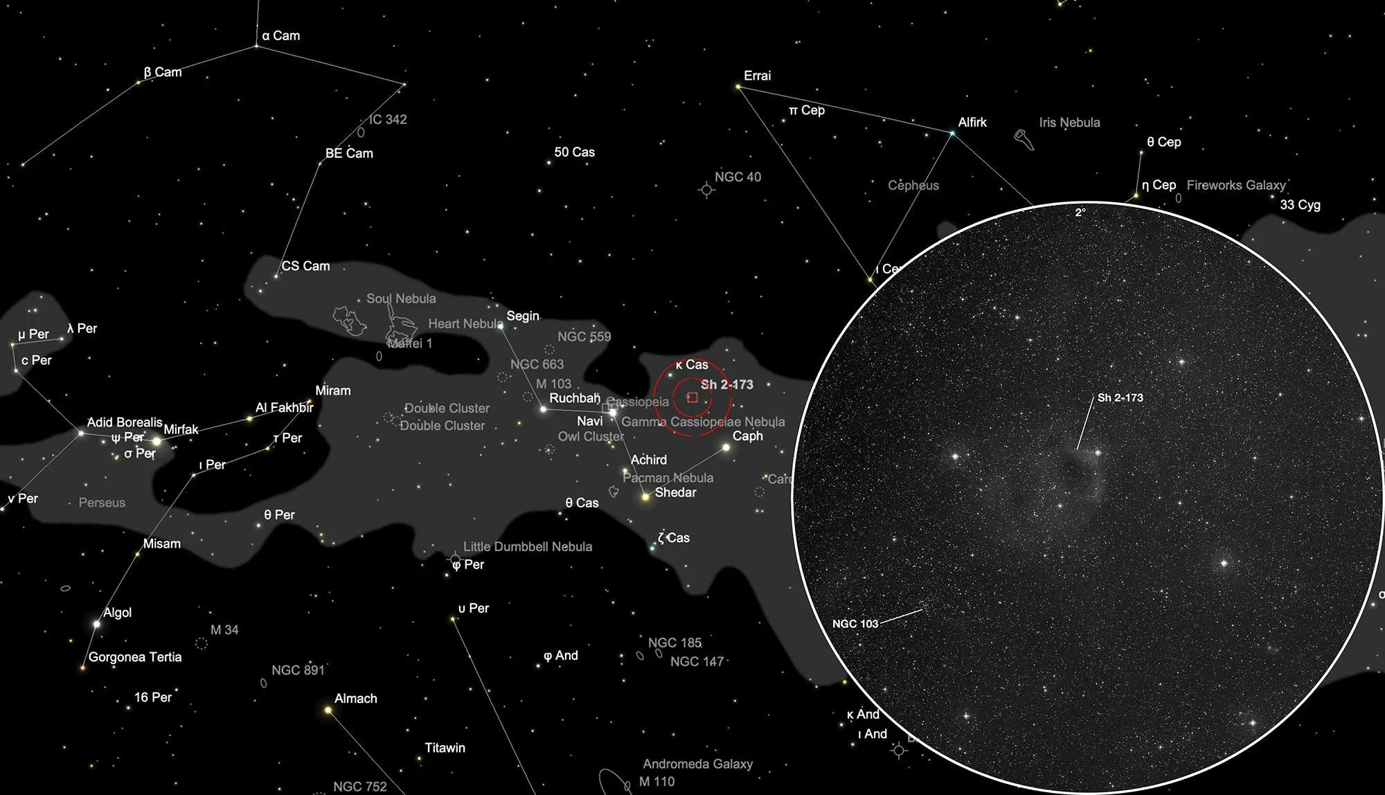 Sh 2-173 liegt am dichten Rand einer großen (∼5°) H I-Hülle, die als GSH 117.8+1.5−35 bekannt ist. Es gibt Hinweise darauf, dass Sh 2-173 Teil eines hierarchischen Sternentstehungssystems aus drei Generationen sein könnte. In diesem Szenario wurde die ausgedehnte H I-Hülle – vermutlich durch die Aktivität der Cas OB5-Assoziation entstanden – zum Auslöser für die Bildung von Sh 2-173, das seinerseits nun die Entstehung neuer Sterne in seiner umgebenden Molekülwolke anregt. Sh 2-173 gilt als junge H II-Region mit einem Alter von etwa 0,6–1,0 Myr, während für die größere Hülle ein dynamisches Alter von rund 5 ± 1 Myr angenommen wird. Die Entfernung zu Sh 2-173 wird auf 1,8 bis 3,1 kpc geschätzt. [746]