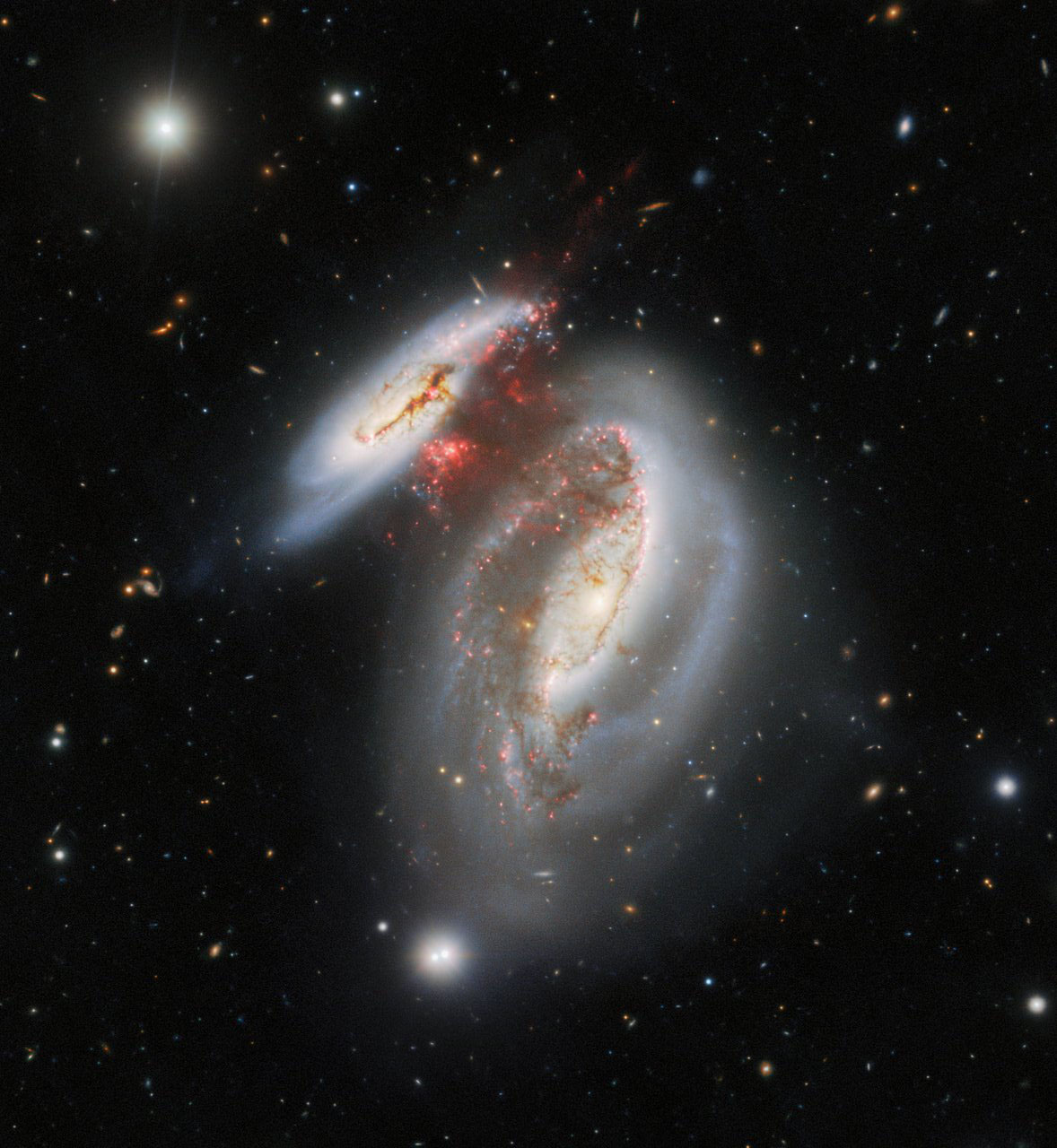 Die ungewöhnliche Form der «Taffy-Galaxien» UGC 12914/5 ist das Ergebnis einer frontalen Kollision, die vor etwa 25 Millionen Jahren stattgefunden hat und zu einer Brücke aus hochgradig turbulentem Material geführt hat, die sich zwischen den beiden Galaxien erstreckt. Obwohl diese intergalaktische Brücke von sternbildendem Material wimmelt, unterdrückt ihre turbulente Natur die Sternentstehung. Die Entfernung zu den Galaxien wird auf 180 Millionen Lichtjahre geschätzt. [754]