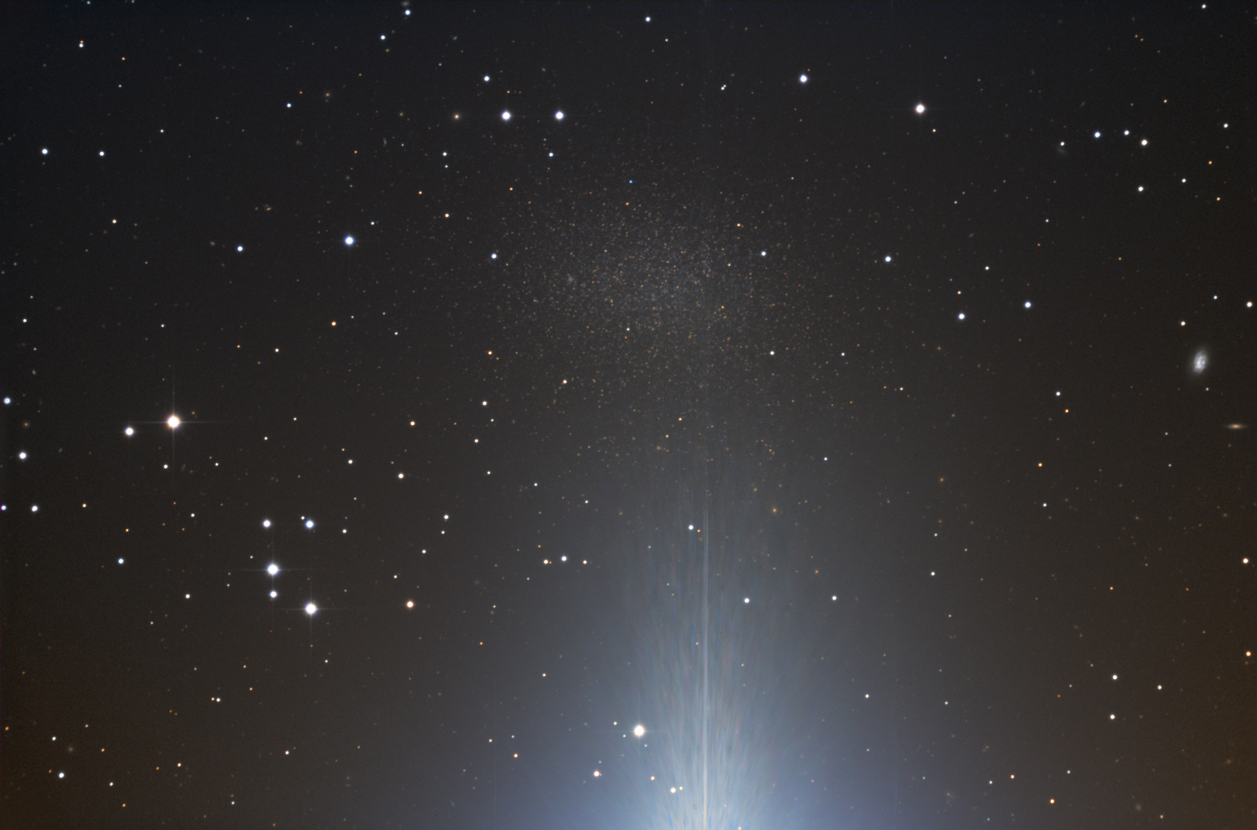 762 mm Öffnung: Wird Regulus außerhalb des 0.52° großen Gesichtsfeldes gehalten, so ist nördlich von diesem bei 192-facher Vergrößerung (Tele Vue Ethos 13mm) ein kleines elliptisch-förmiges Watte-Bäuschchen sichtbar. — 30" SlipStream-Dobson f/3.3, Hasliberg, 17. 2. 2021, Eduard von Bergen