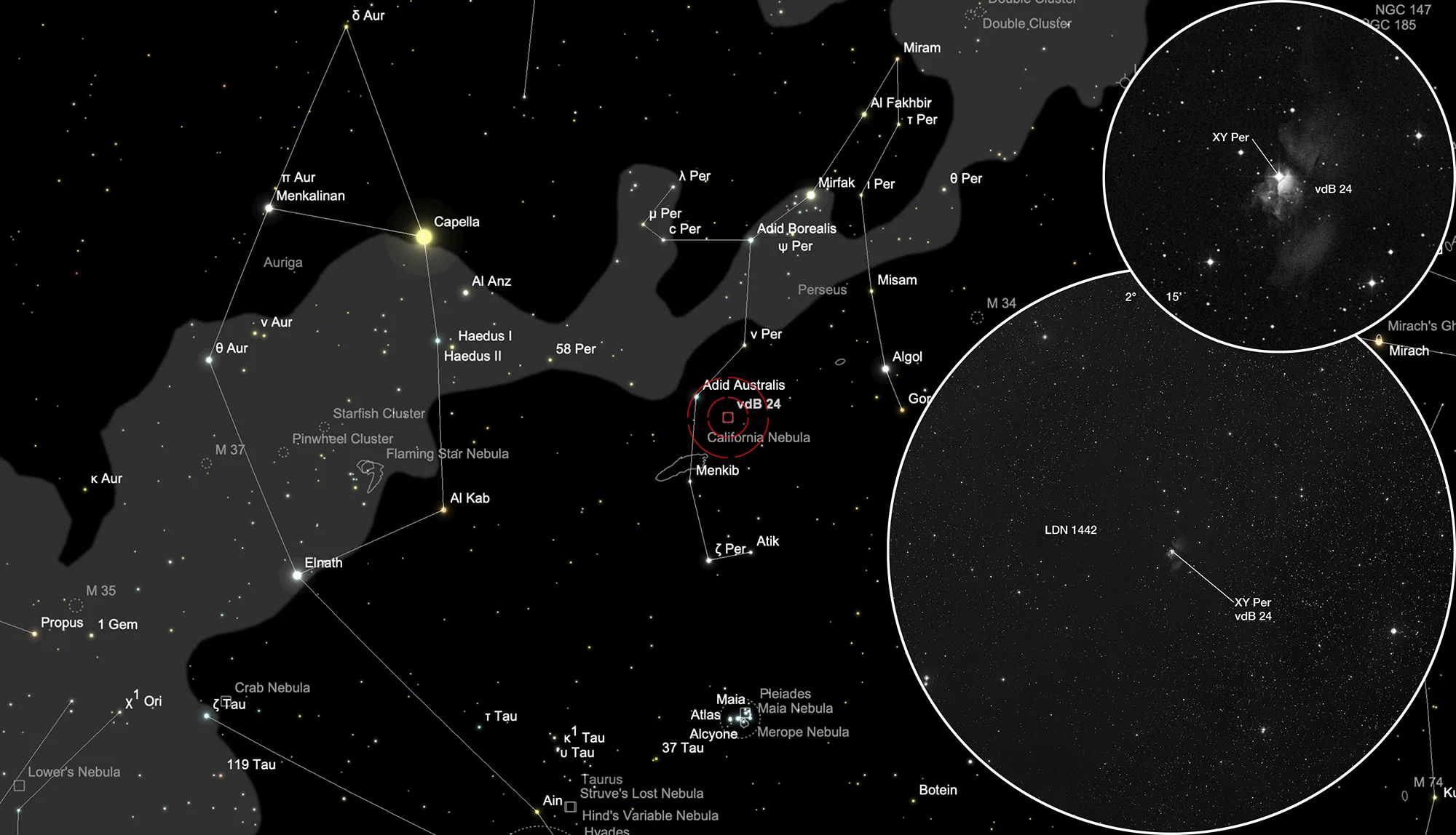 XY Persei is a variable star and visual binary system with a Herbig Ae primary (9.43 vMag) and a B6Ve secondary (10.14 vMag) separated by 1.4". [752] VdB 24 is a reflection nebula, illuminated by this binary star, likely the same interstellar dust cloud LDN 1442.
